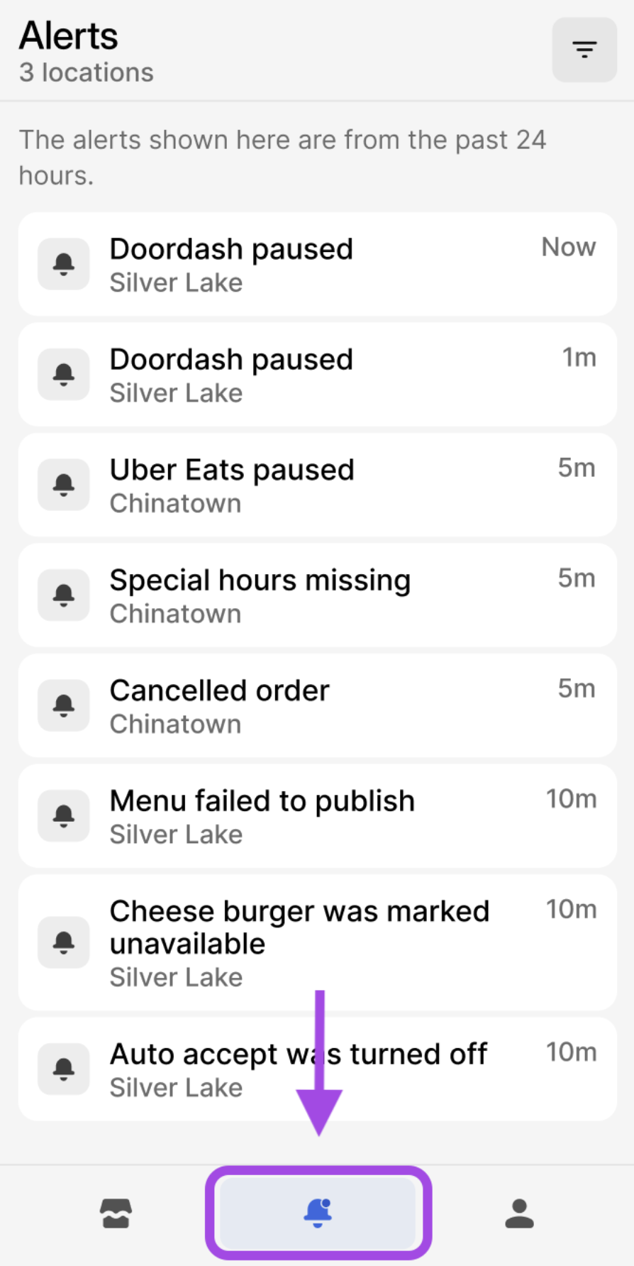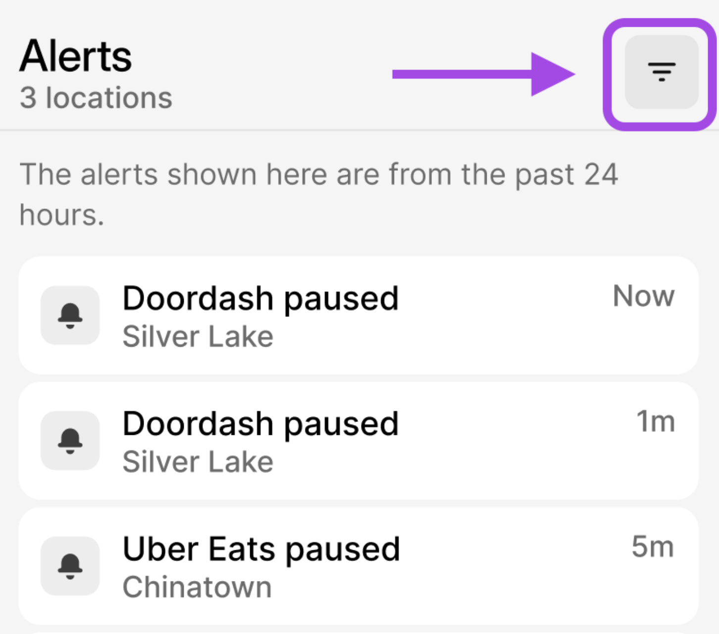 To filter for a specific Brand or Location, click the Filter button at the top of the Alerts page.