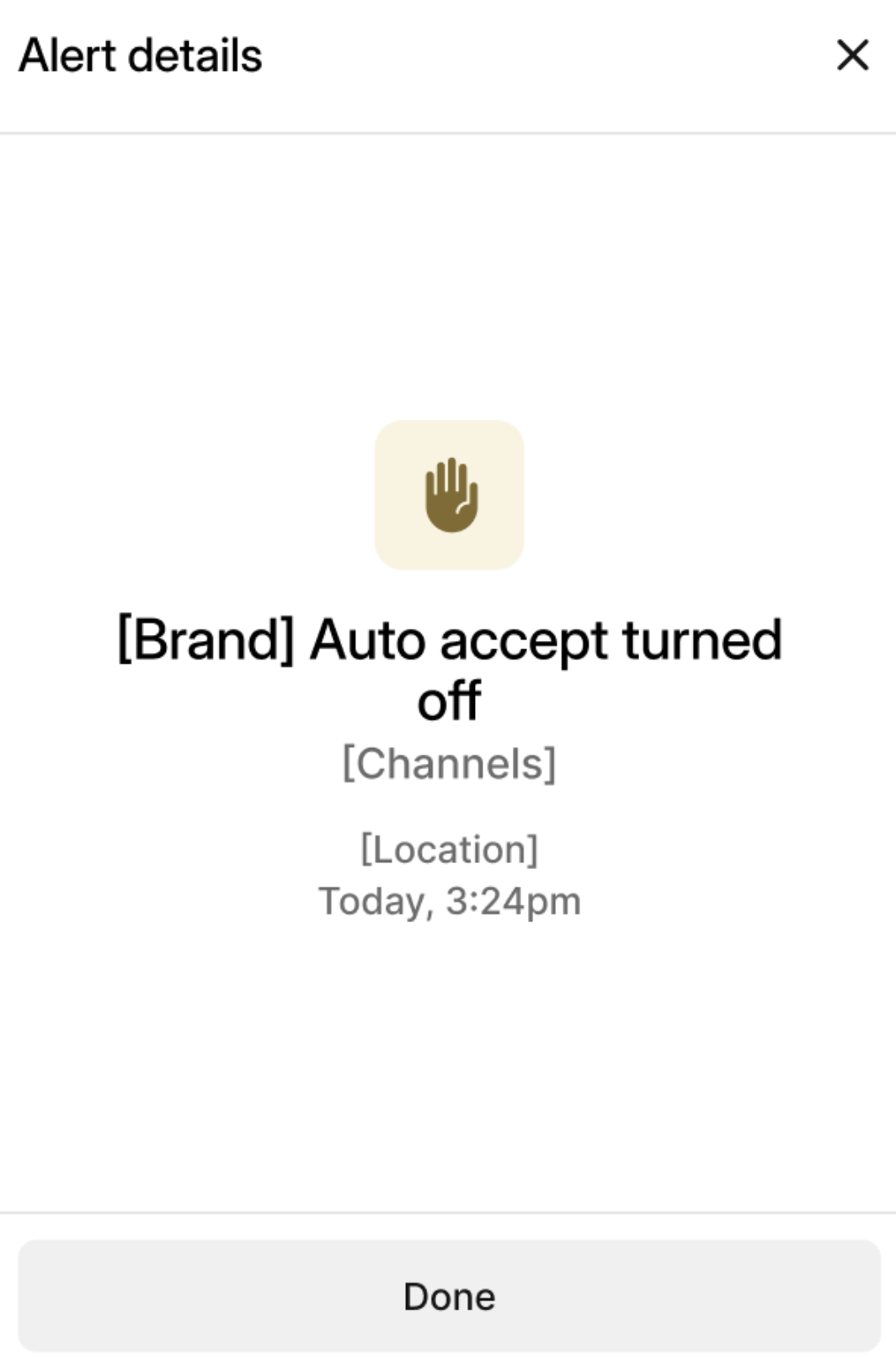 If a brand has turned off the auto-accept orders setting in the Otter Dashboard or Otter device, the user will receive an Auto-Accept Turned Off Live Alert.
