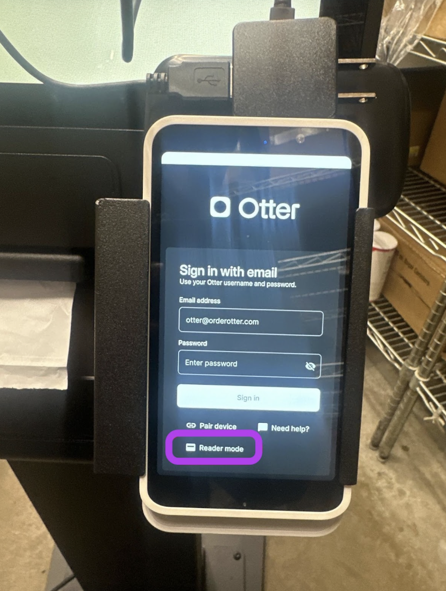 - Once card reader has been paired, the Stripe Card Reader will show the Otter App login screen. On the card reader, click “Reader Mode” on the bottom of the Otter Login Screen