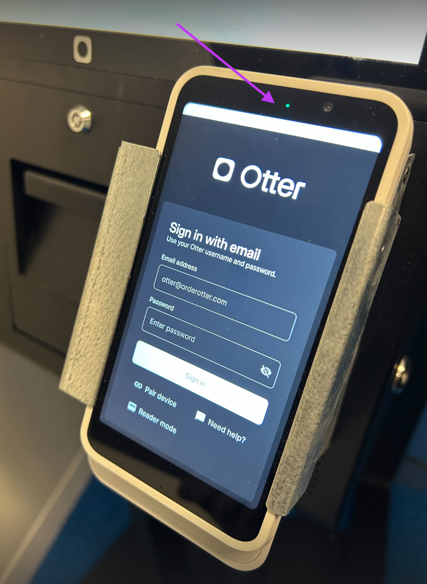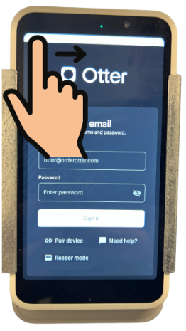 Step Process Image 1 On the top of the kiosk screen, hold your finger in the middle (about 5 seconds) until the admin pin window pops up. 2 Enter admin PIN 641804. 3 Select Terminal > Terminal Set-up. 4 Follow the Payment Terminal Setup prompts to the Generate Pairing Code enter screen. 5 Confirm the card reader is connected to WiFi by swiping left to right on the top of the card reader to access network settings. 6 Enter admin PIN 641804. 7 Once the WiFi signal is confirmed on the reader, select Pair device. 8 Enter the pairing code shown on the card reader directly on the kiosk. 9 Tap Reader Mode on the bottom of the Otter Login screen displayed on the card reader. -
