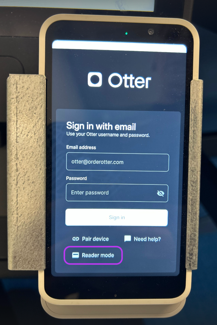 For s700 readers being used as a kiosk card reader, when it exits Reader Mode it will display the Otter login screen. To resolve this, do not login— just tap Reader Mode at the bottom of the screen.