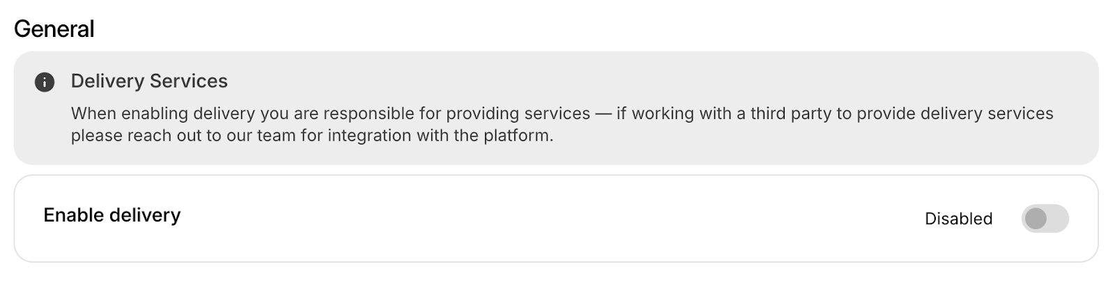 When enabling delivery for catering, you are responsible for providing services — if working with a third party to provide delivery services please reach out to our team for integration with the platform.
