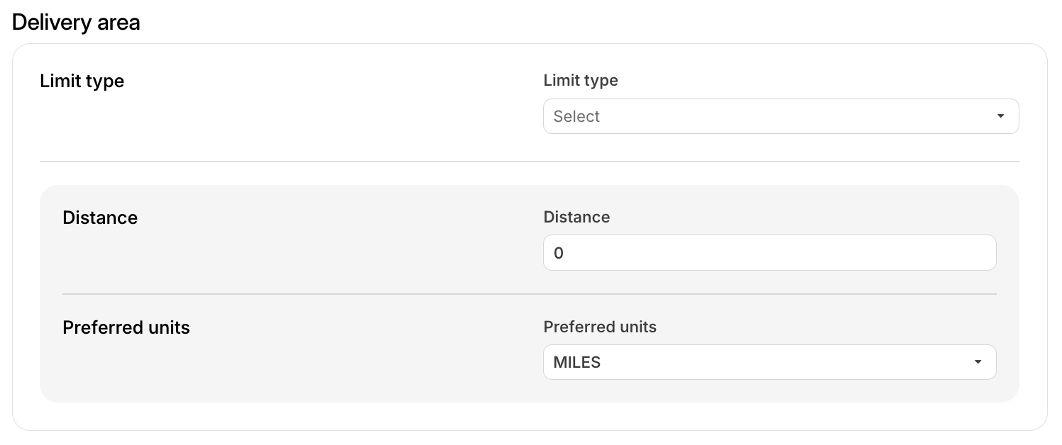 | Distance | Enter a mile or kilometer amount of allowance for delivery range. |