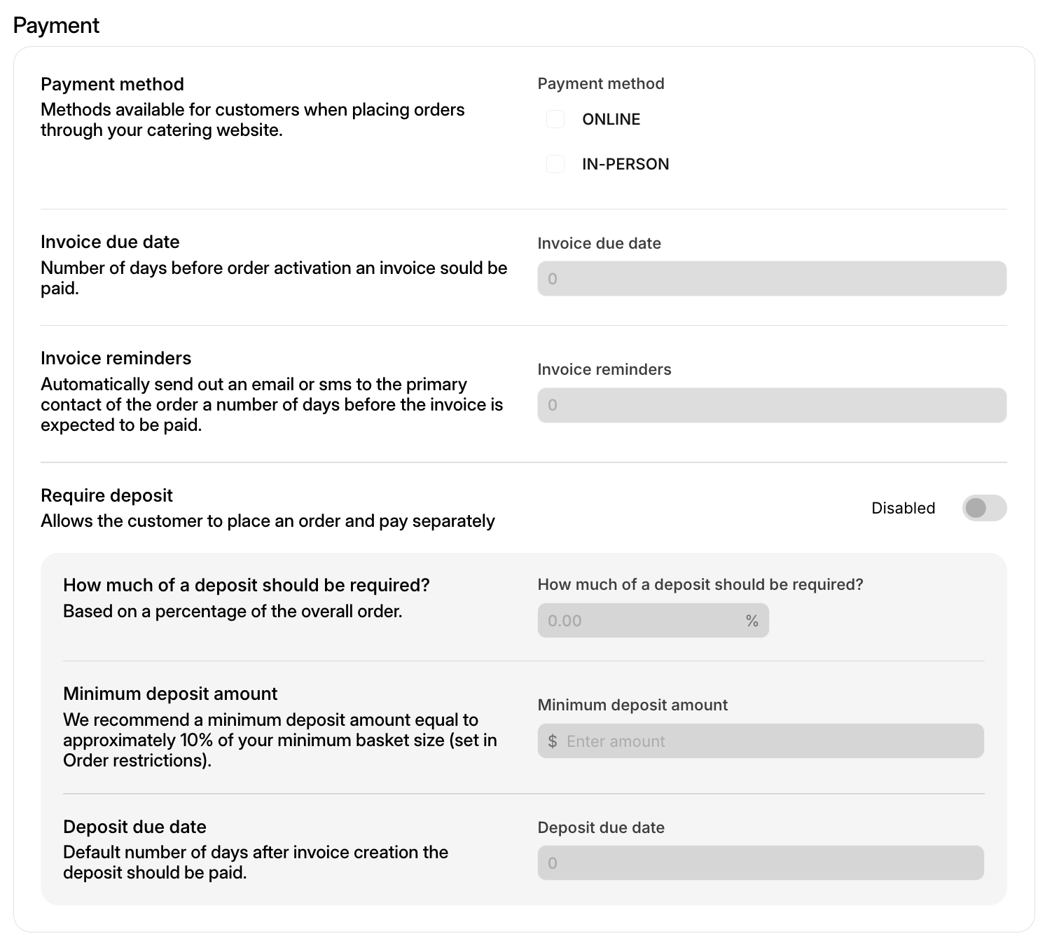 | Payment Method | Check to accept payment methods Online or allow In-person payments for online catering orders. |