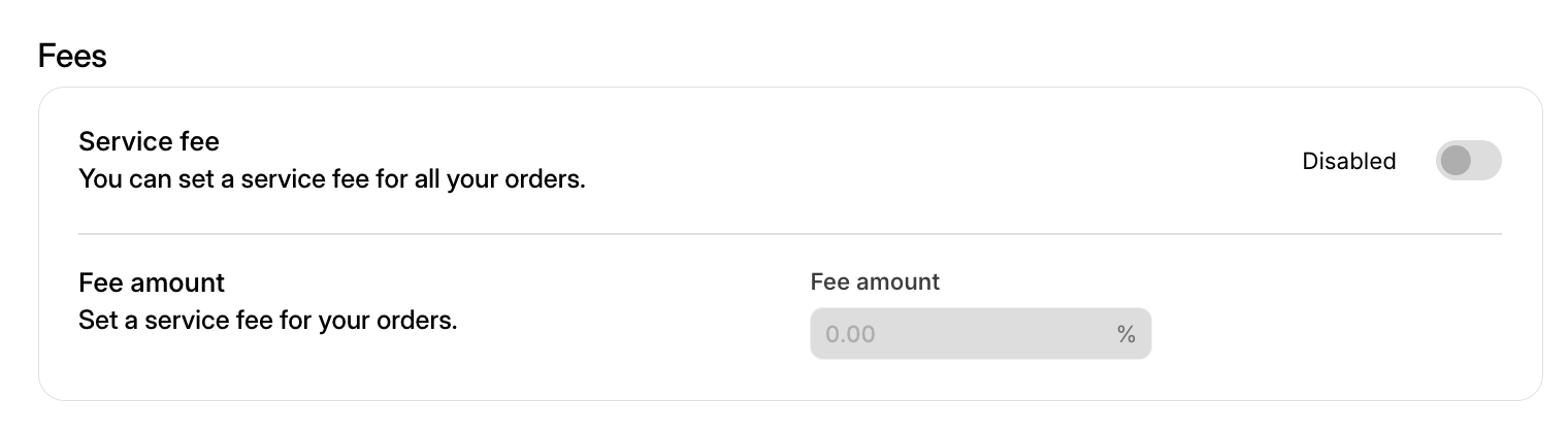 Toggle to enable or disable a service fee applied to all catering orders. Enter a percentage fee amount. |