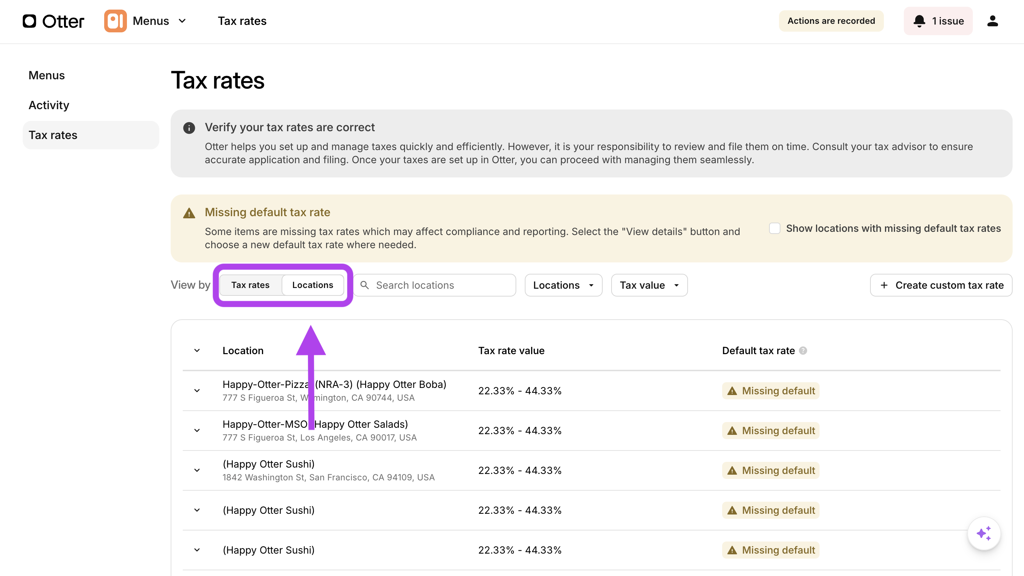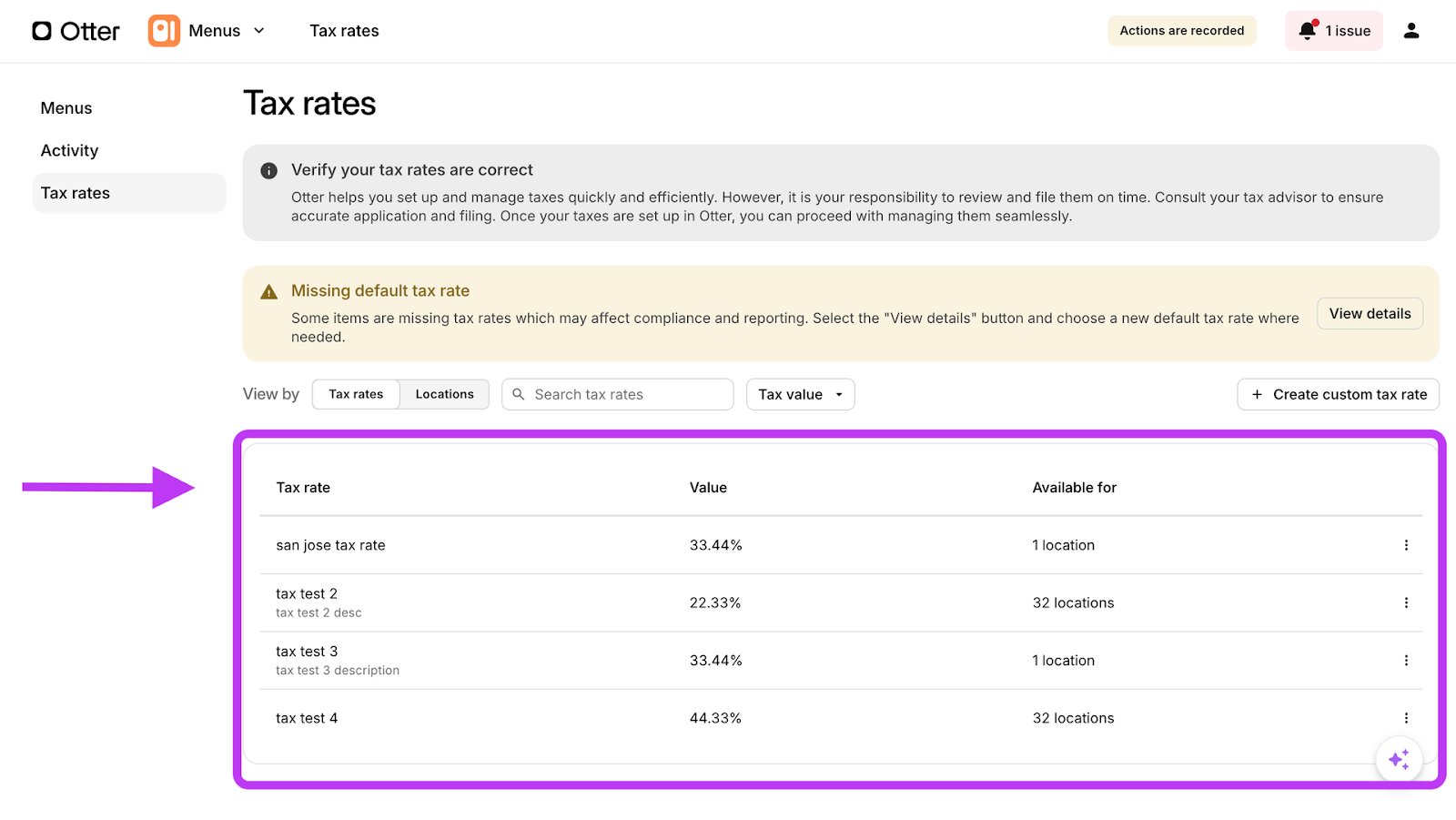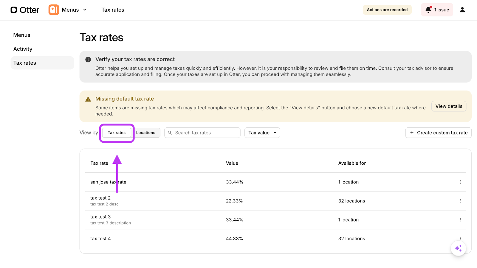 - Filter by location or by tax rate value (e.g., view all locations using a specific tax rate).