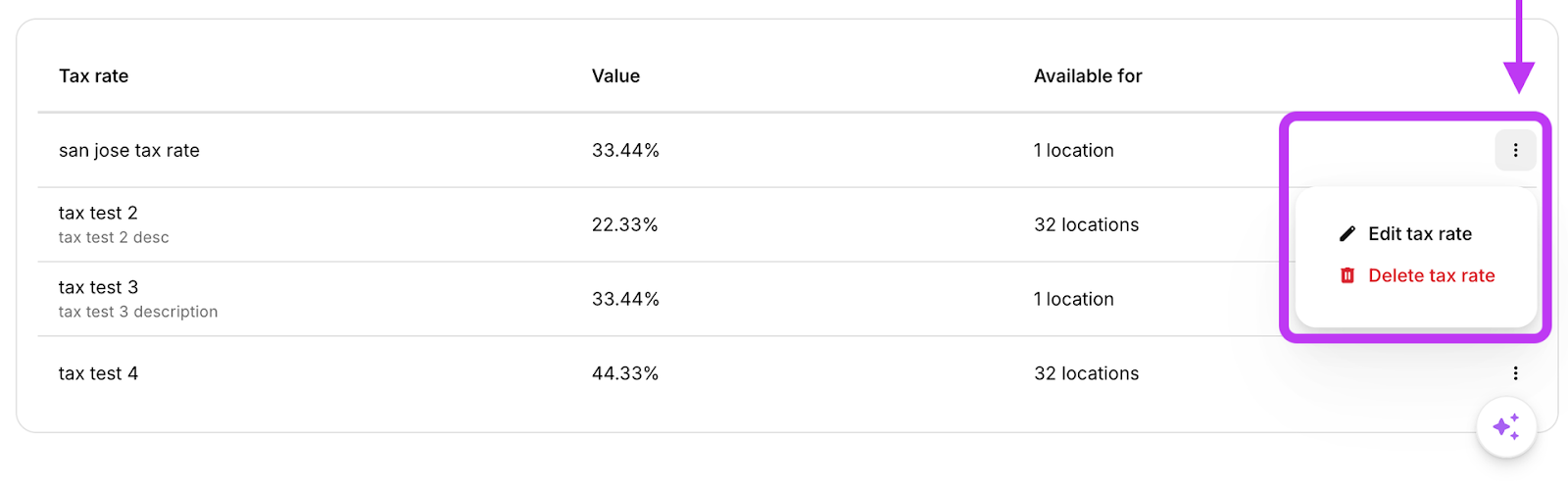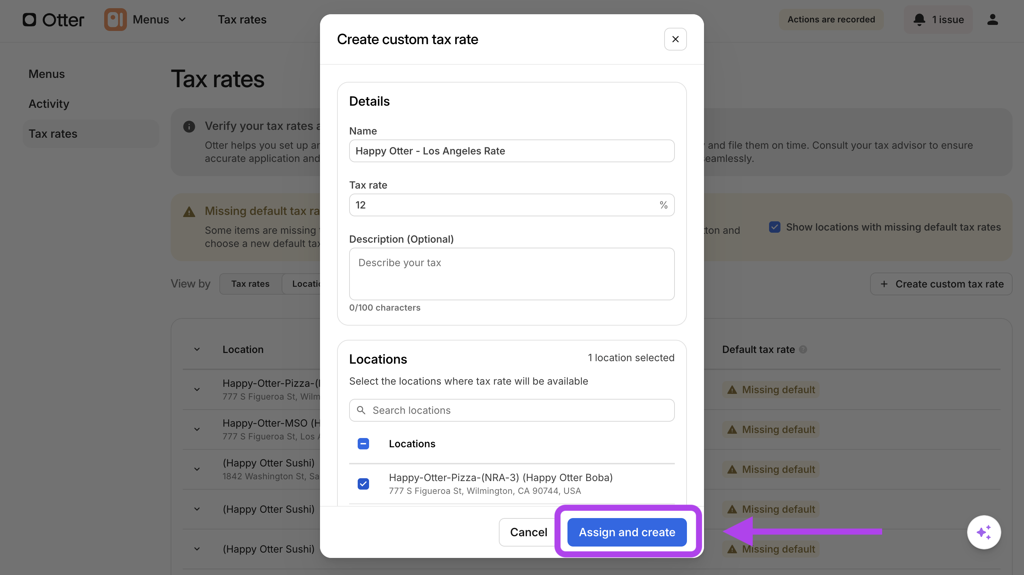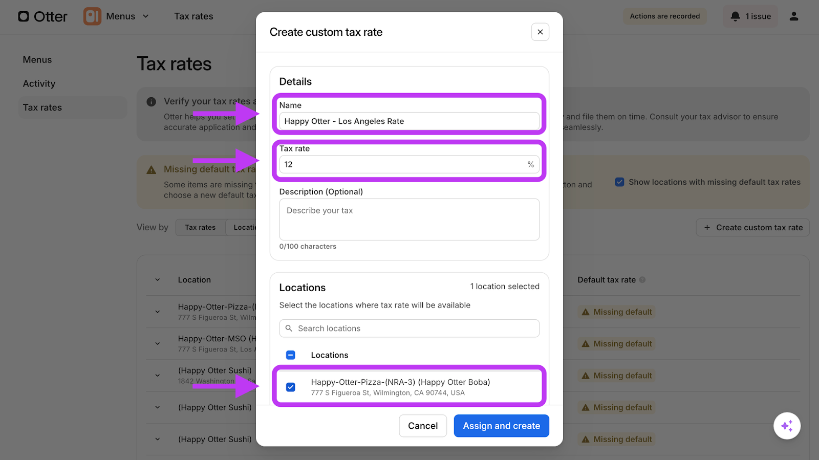 3 Once all required information is entered, click the “Assign and Create” button. 4 The window will close, and you will be redirected back to the Tax Rates main page, where the newly created tax rate will be displayed in the list. 5 Click on the three dots (⋯) menu next to a tax rate to edit or delete the custom tax rate setting.