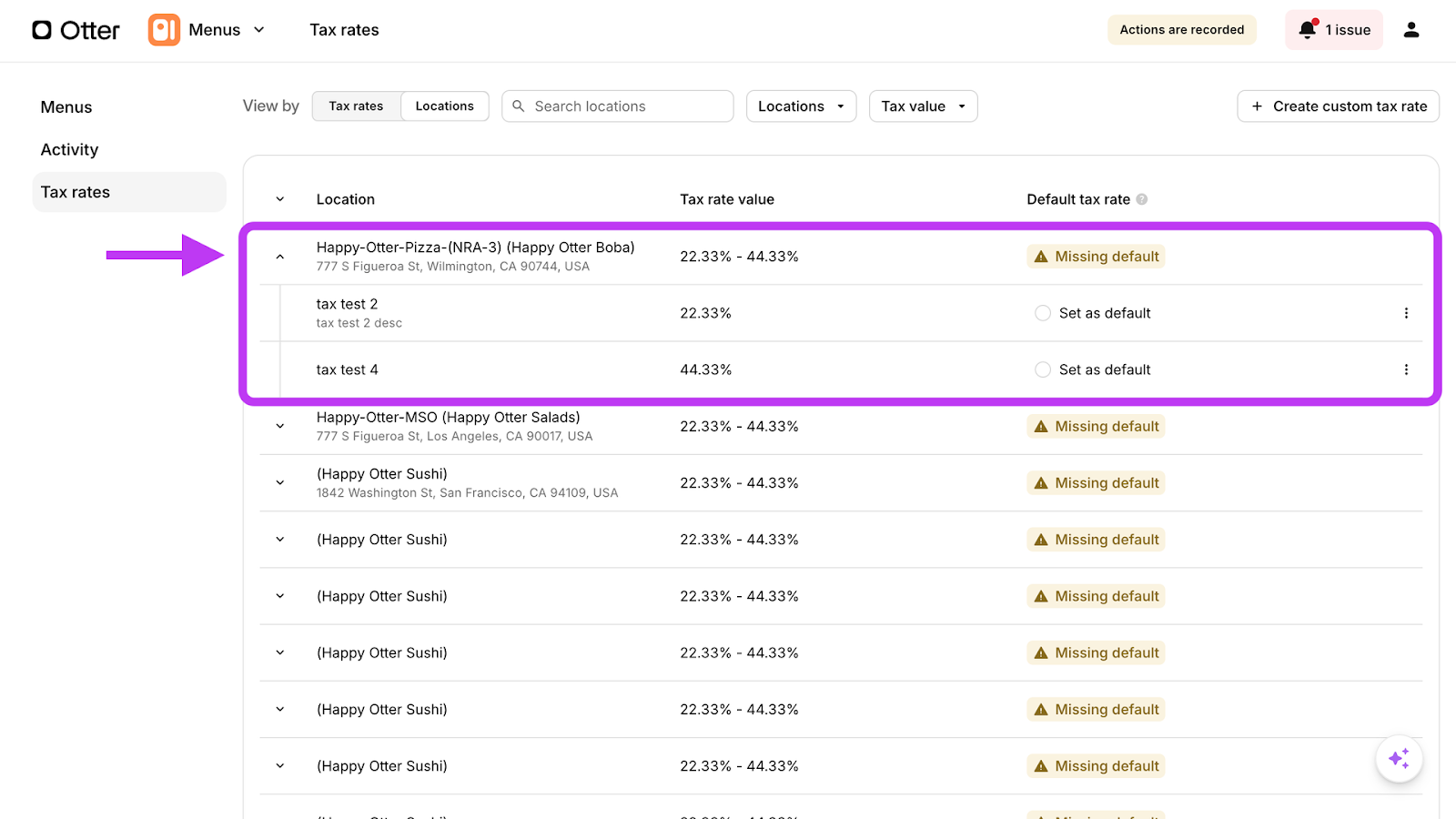 - Review the tax name, rate value, and how many locations the tax rate is applied to.