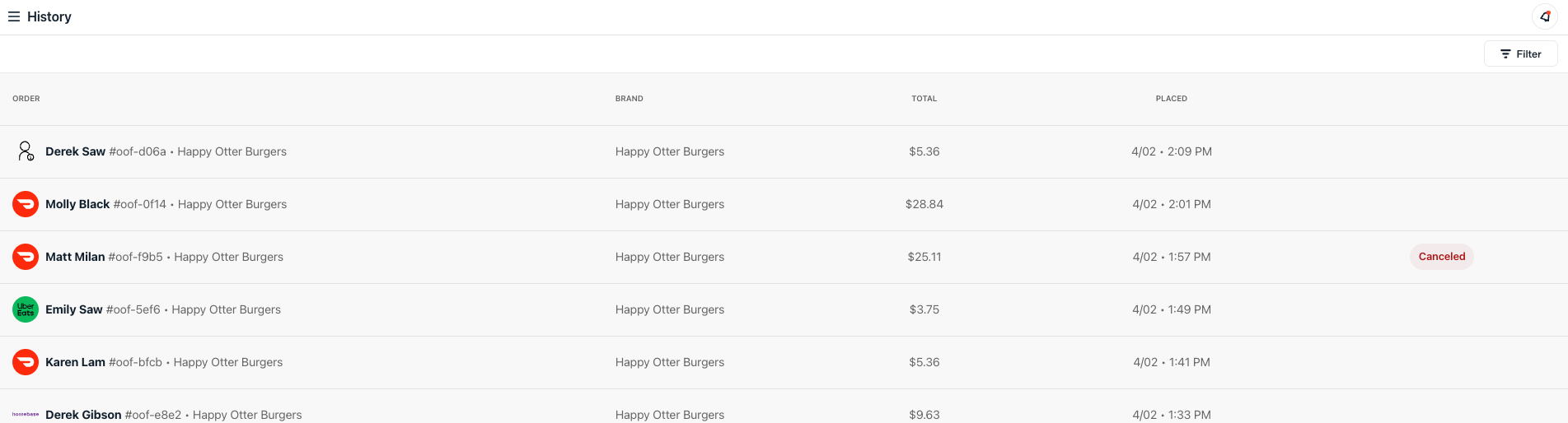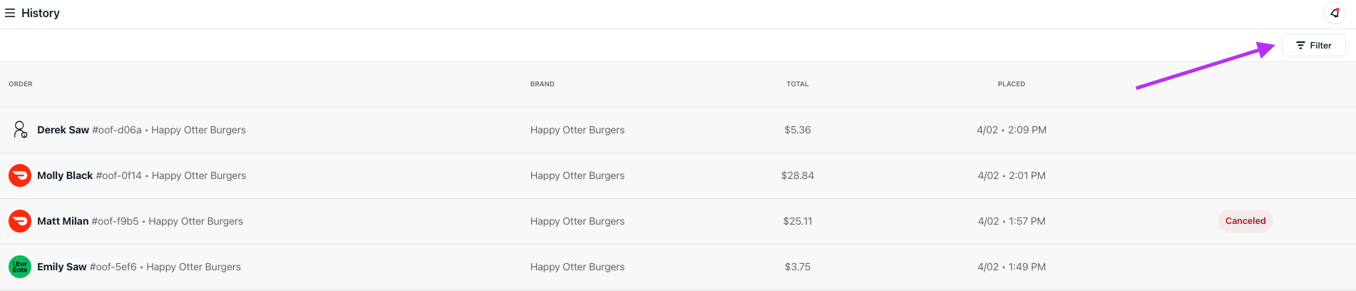 Order History shows all orders— from all platforms (like delivery partners, Otter POS, and other direct orders)— that have come through Otter.
