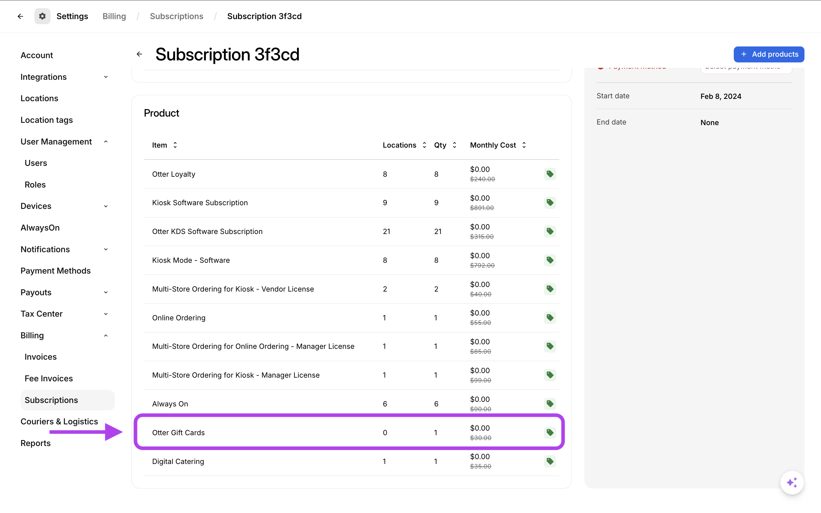 Go to your Otter Dashboard Subscription Settings. Make sure that you see the Otter Gift Card product listed in your Otter Subscription. |