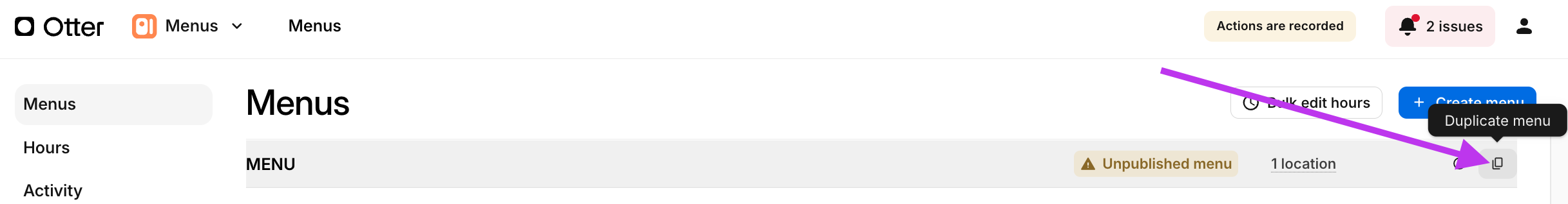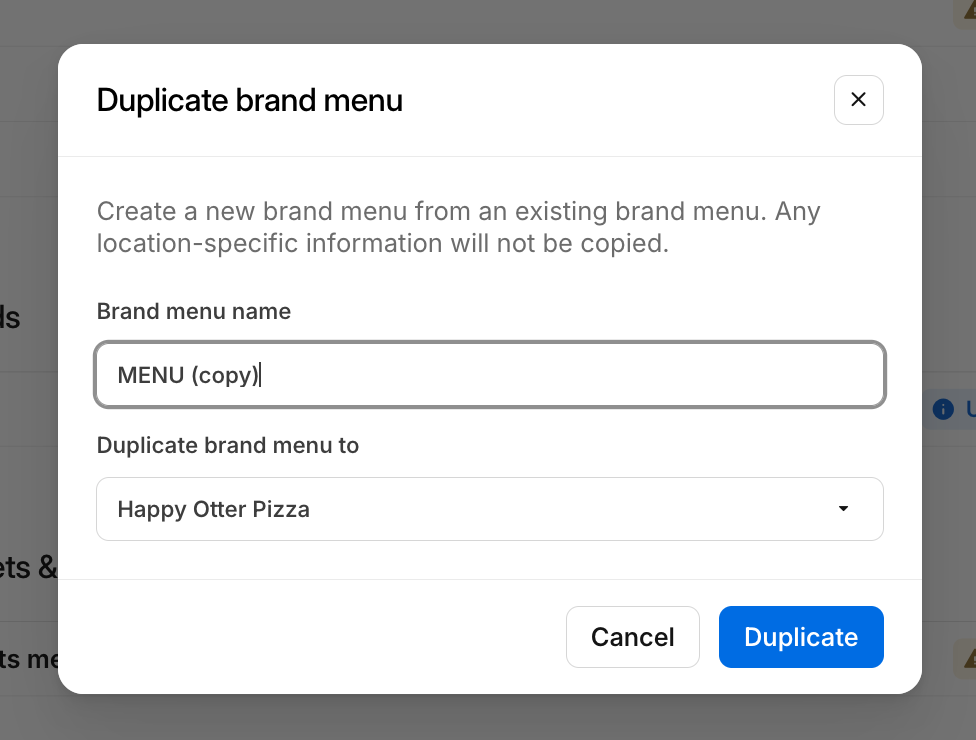When trying to update the allergen or calorie information for menu items, if you receive an error message, try the following steps to resolve.Step Process Image 1 Click to Duplicate the menu you're trying to update. 2 Confirm name & duplication brand.