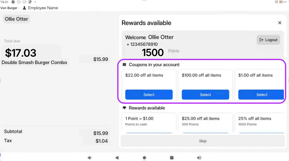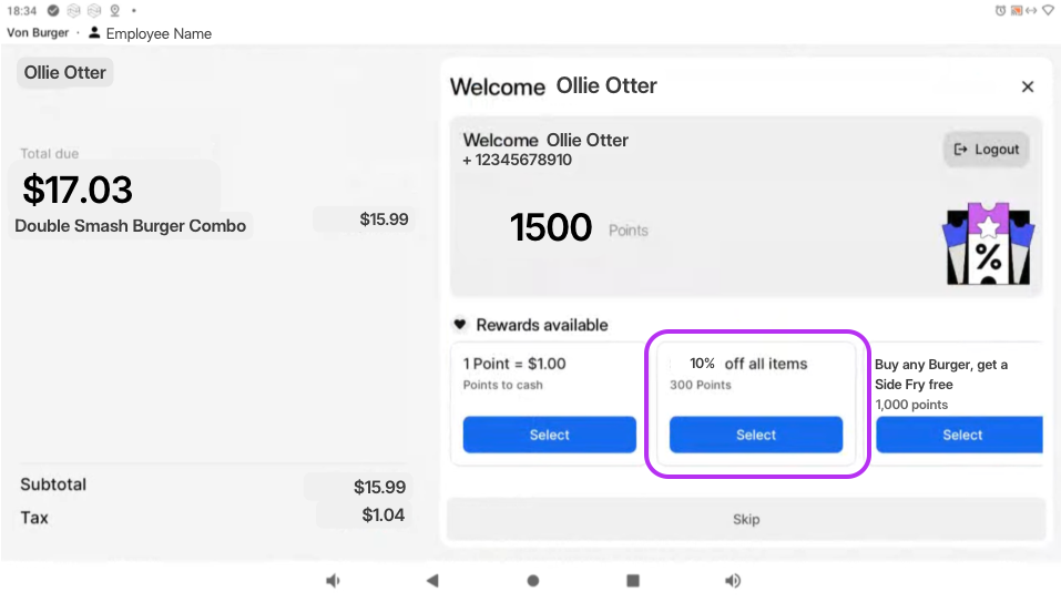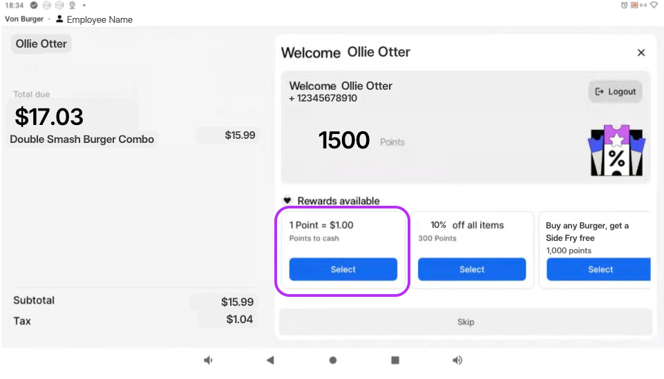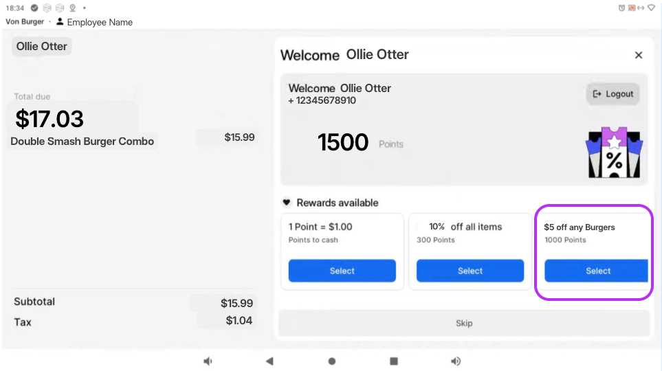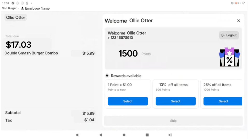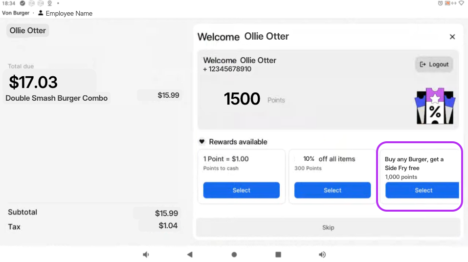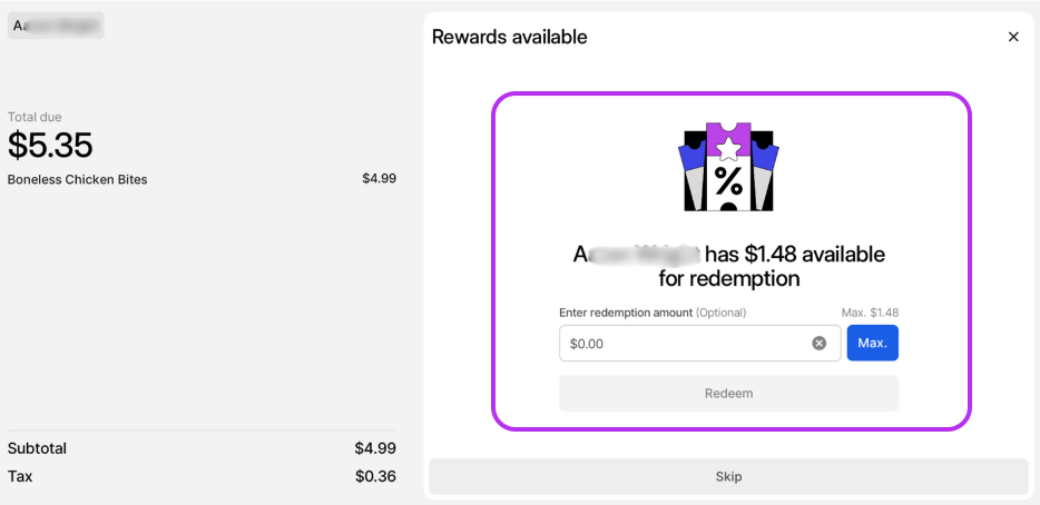 Loyalty sign-up and redemption can be completed directly on the customer-facing POS screen by the eater.
