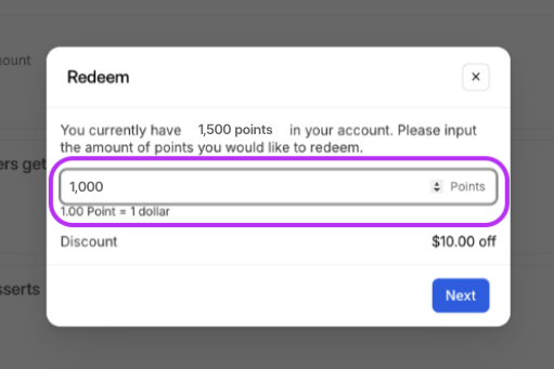 If you only have “points to cash” as a redemption option, you’ll see the amount of points available— from there, you can just type in the amount of points the eater wishes to redeem for.