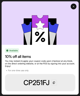 - Eater using loyalty points to redeem coupons within Loyalty portal to enter on Kiosk or an online order