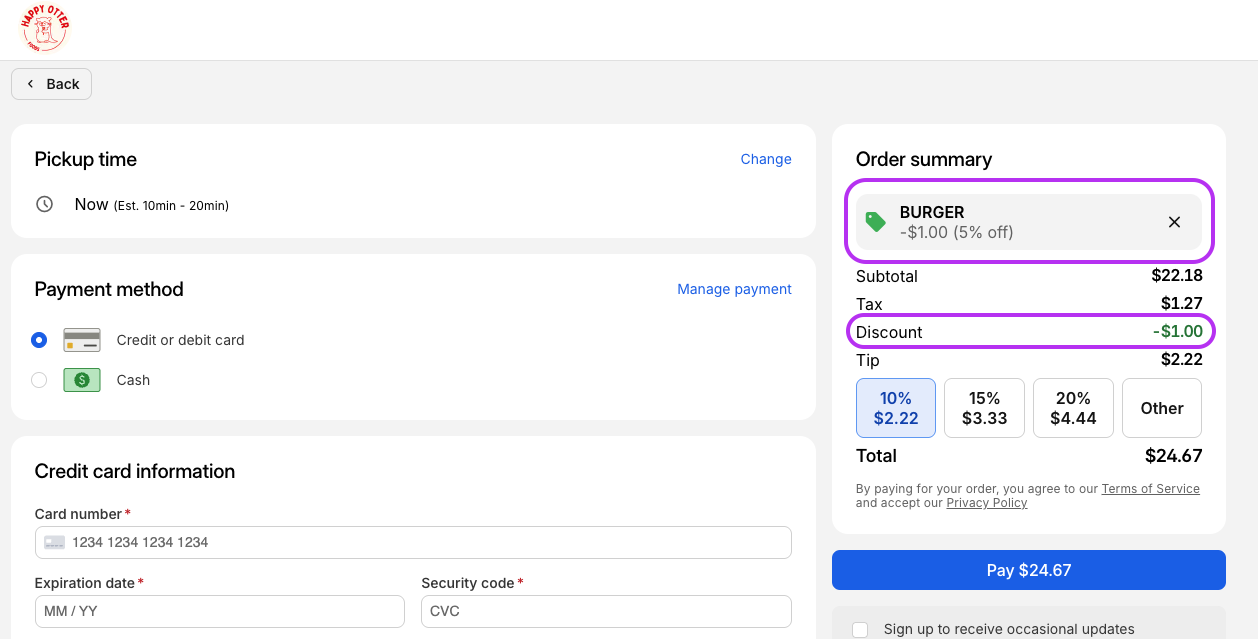 After earning loyalty points for your business, your customers will be able to redeem their loyalty balance for a discount (that you have set) on applied orders.