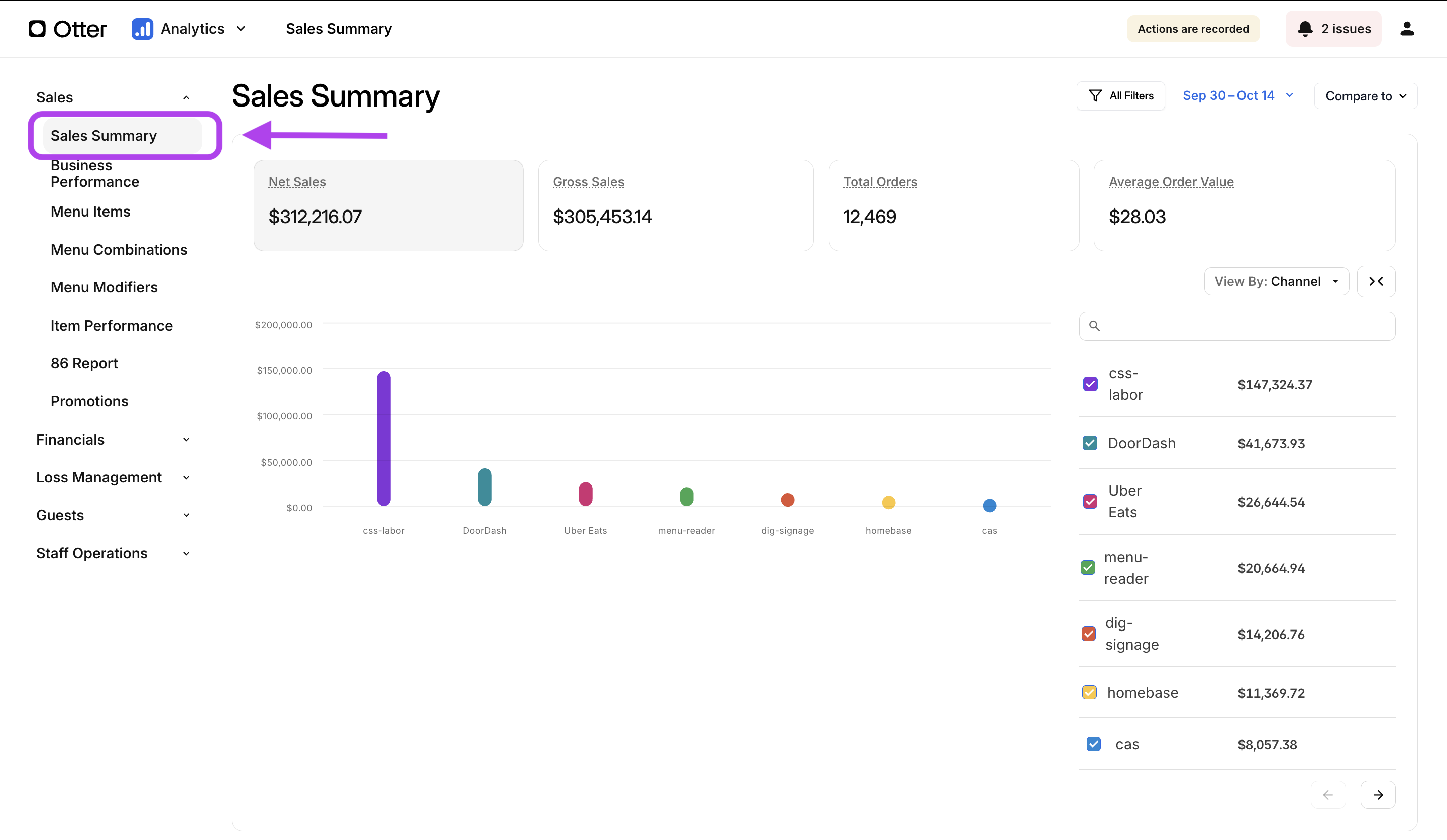 • Data Delays: Delivery partner data may take 24–36 hours to update in Otter Dashboard due to settlements or adjustments made by the delivery service or eater. Due to this delay, Sales Summary should not be compared to live daily sales.