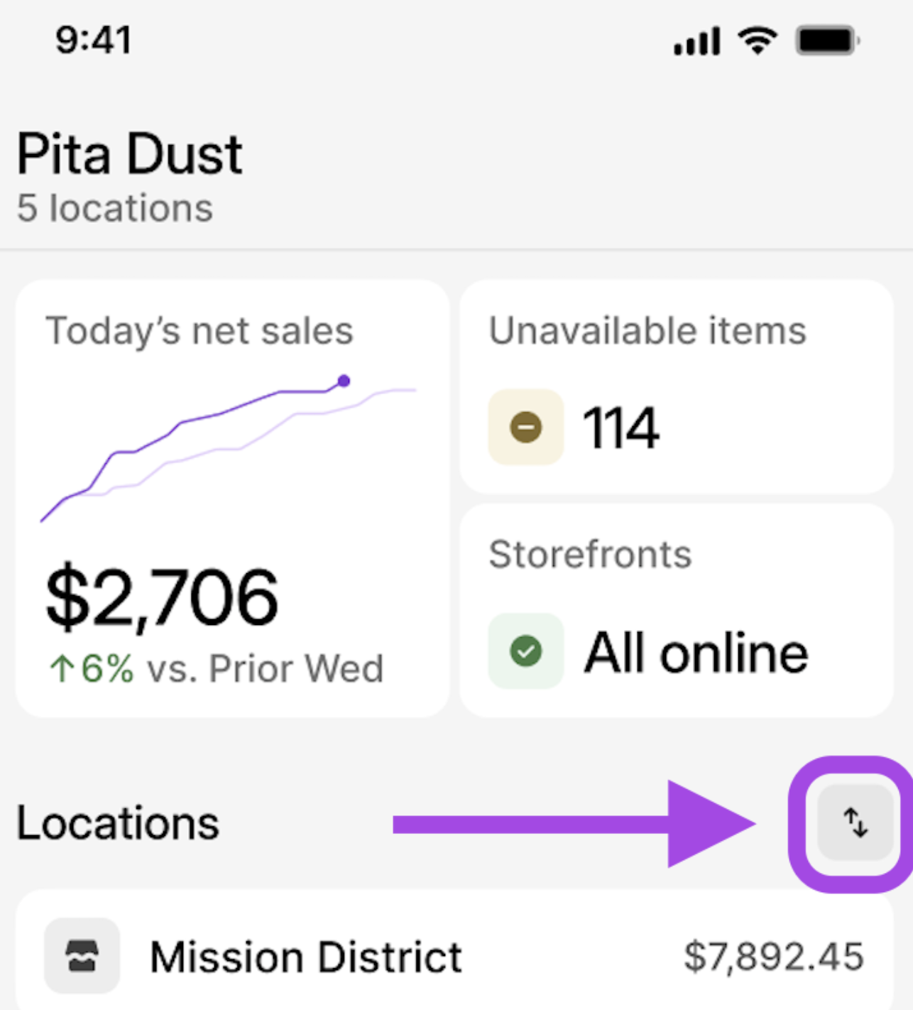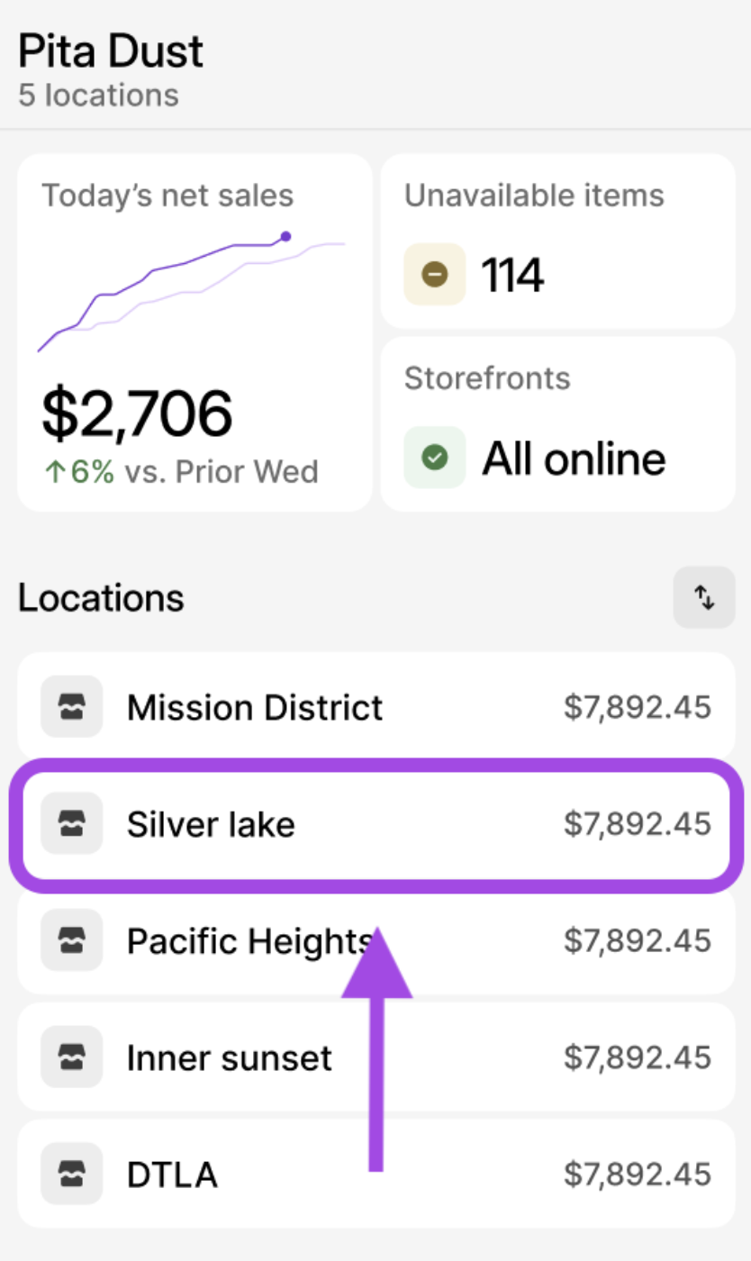 | 3 | After clicking into a specific location from the Home page, a Sales Summary report is generated based on live order data excluding data from unselected locations. | |