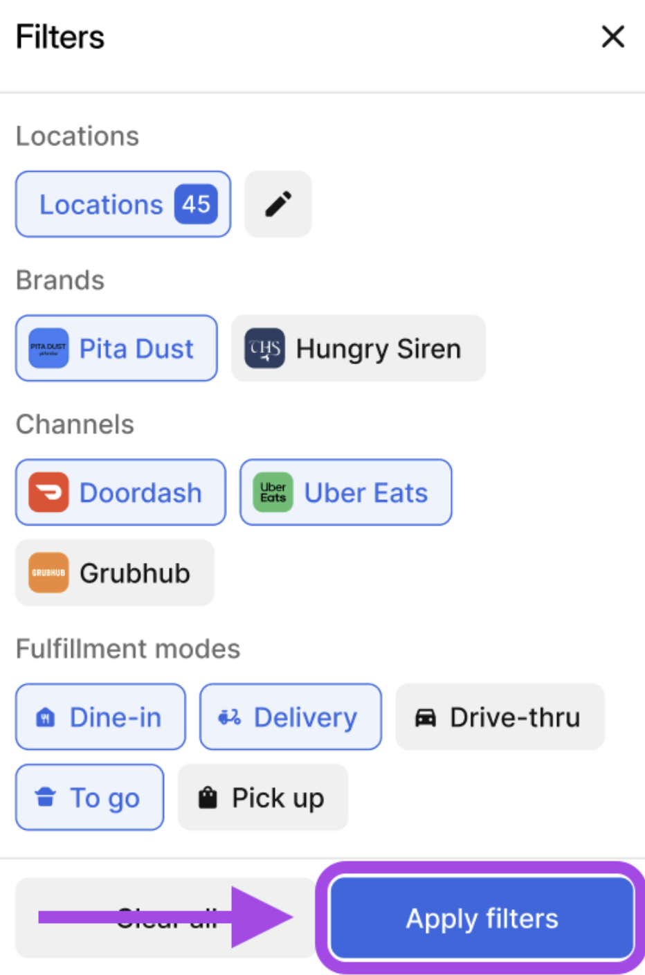 | 4 | To set a filter for specific channel(s), click the Channel filter button. Filter between Channels & Fulfillment Modes to report specified data. After selecting the preferred filters, click the Apply Filters button to run the report. |