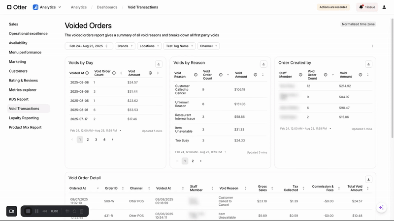 The Voided Transactions report shows a breakdown of all first-party POS transactions that were voided. From this report, you can: