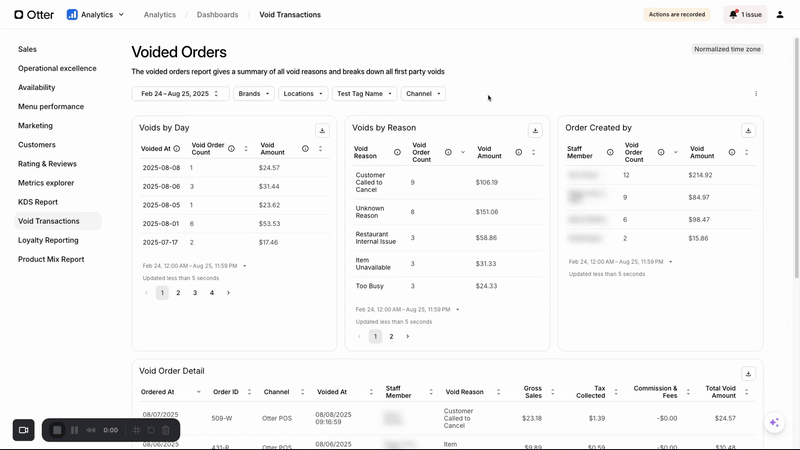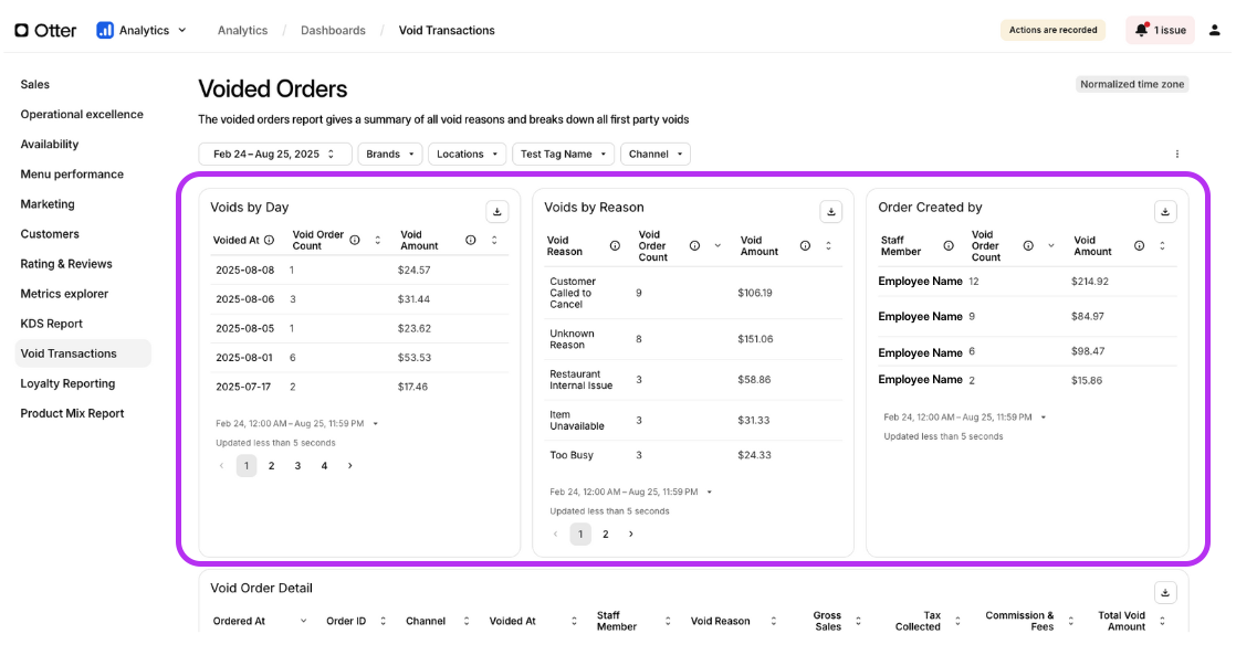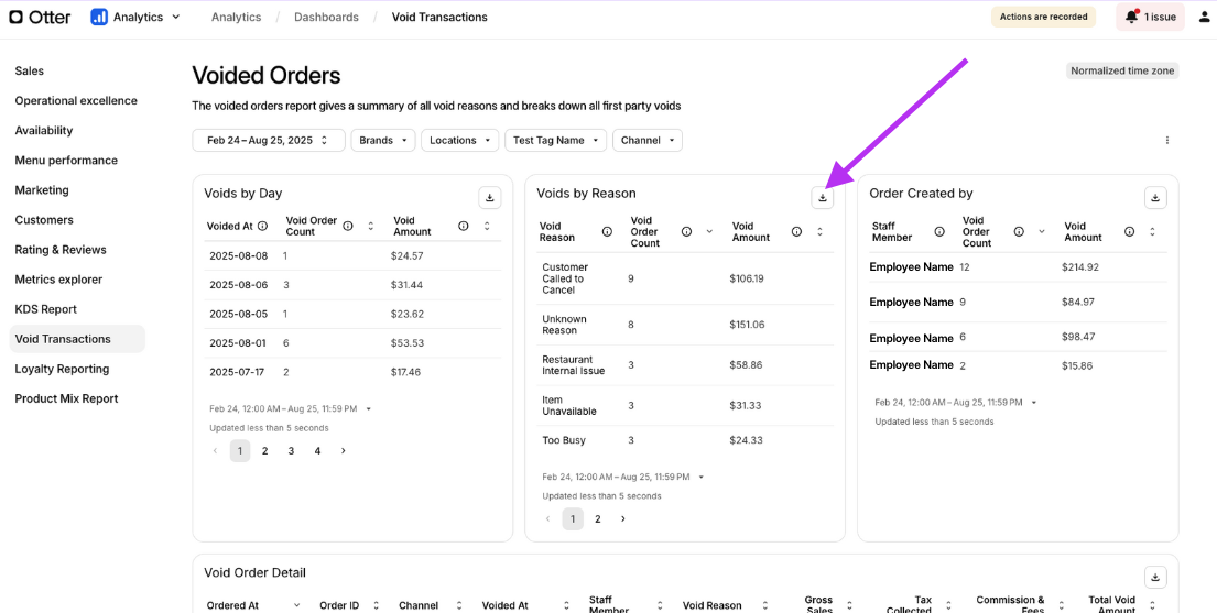 From the Otter Dashboard, click Apps > Analytics. Select the Void Transactions tab on the left-hand side menu.