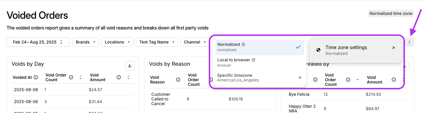 Yes— To change the time zone view of the Voided Transactions report click the 3 dots at the top right corner. Then click Time zone settings and select the desired time zone.