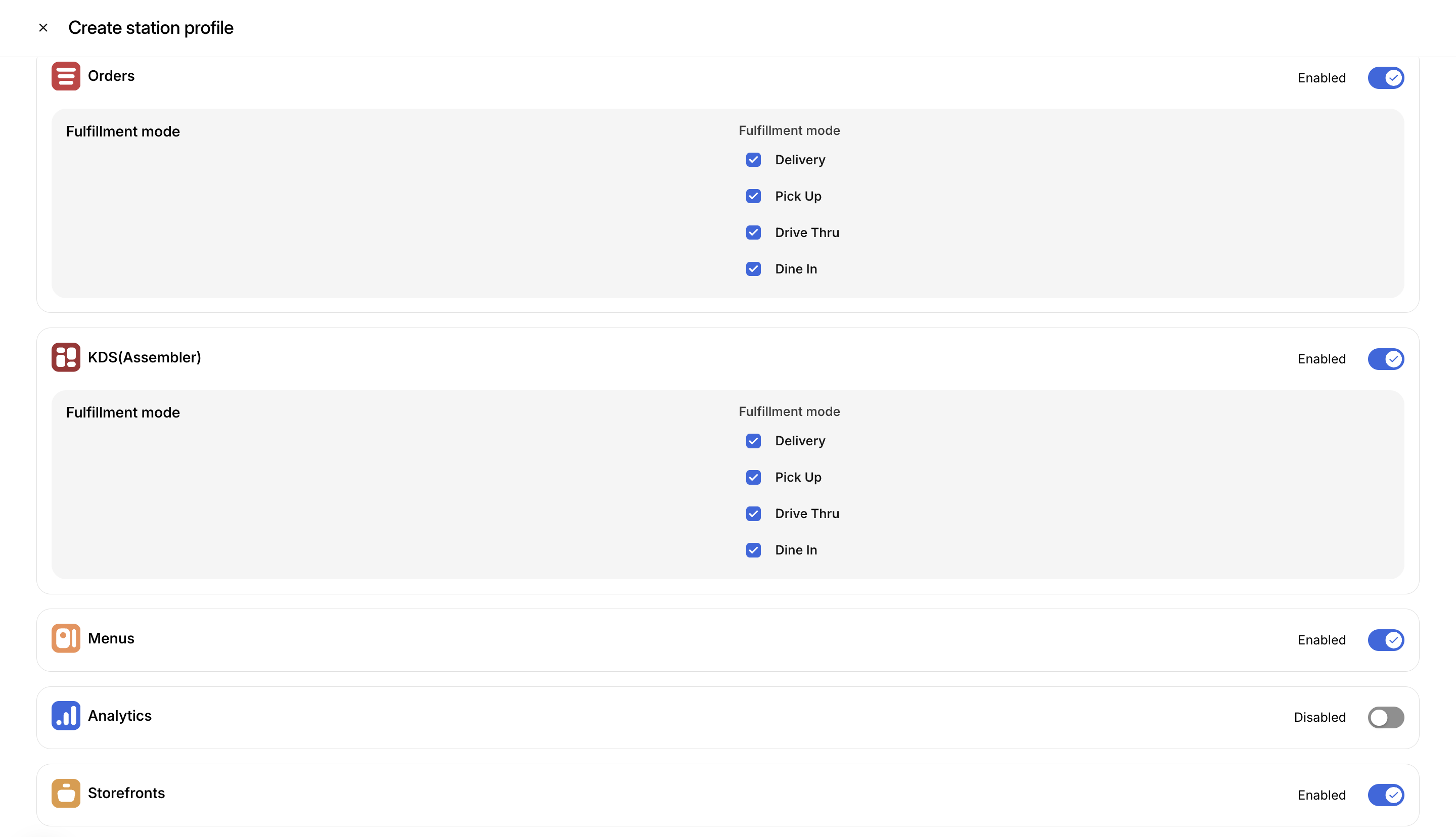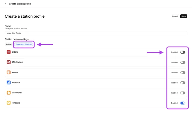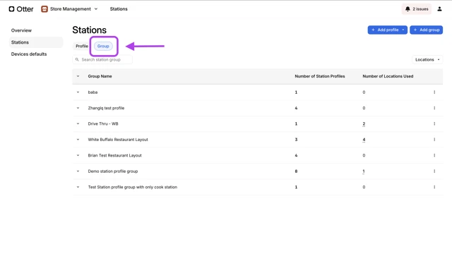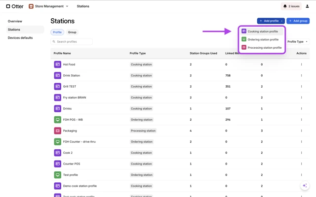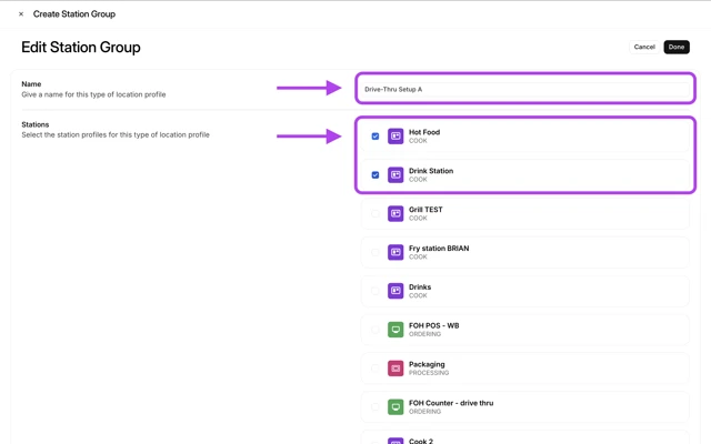 Add station profiles to the group: Use the toggles to select from existing station profiles: Example: “Hot Food” “Drink Station” |