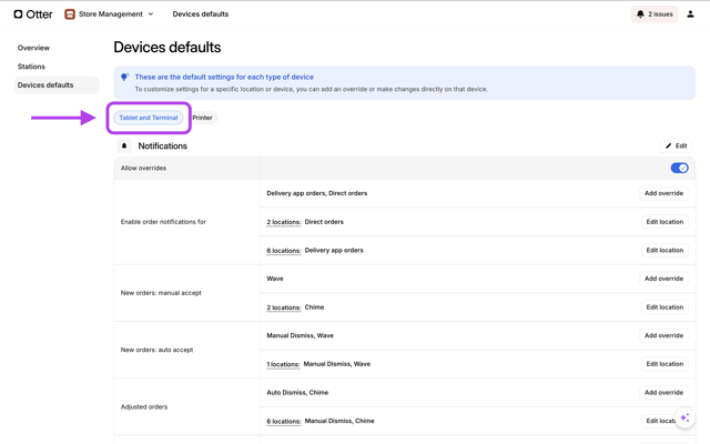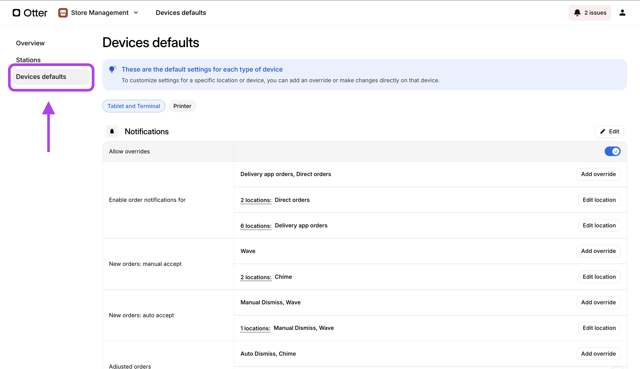 To add an exception for a specific location or device, click Add Override. How to Enable Overrides: Otter Admin users can determine whether or not they want certain locations to be able to override the default behavior by turning on/off the toggle. If you only have access to just a subset of locations, you will only be able to add an override if this 'enable overrides' is toggled on. |
