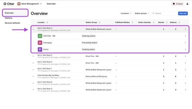 Once saved, the new group appears as a group in the Stations section. Once a location has been assigned to that station group, it will also appear in the Stations Overview. |