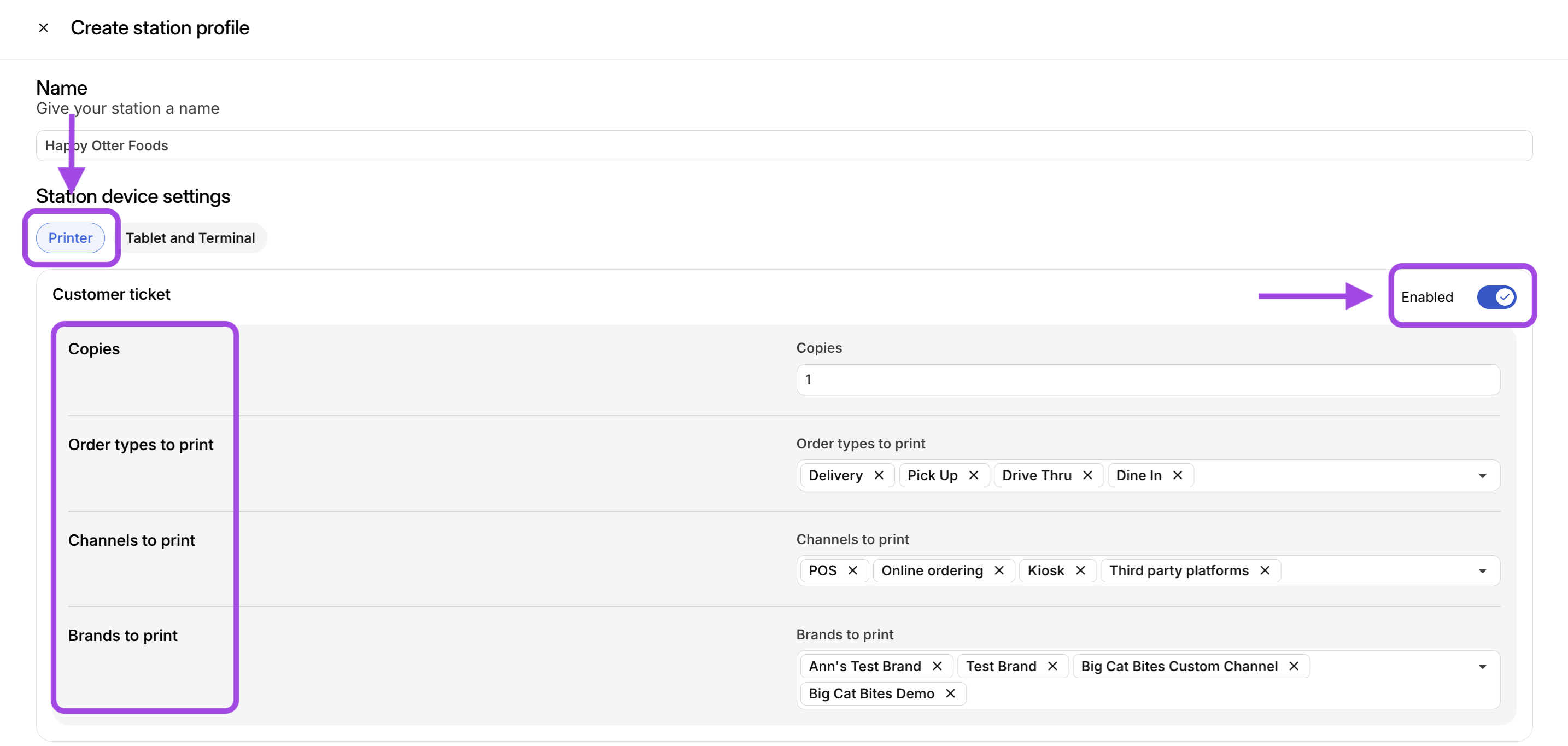 Configure Customer Ticket Printer Settings: The customer ticket setting will be toggled ON by default when creating a Processing Station since this station is for the Assembly KDS & operators can staple customer tickets to pickup/to-go orders.