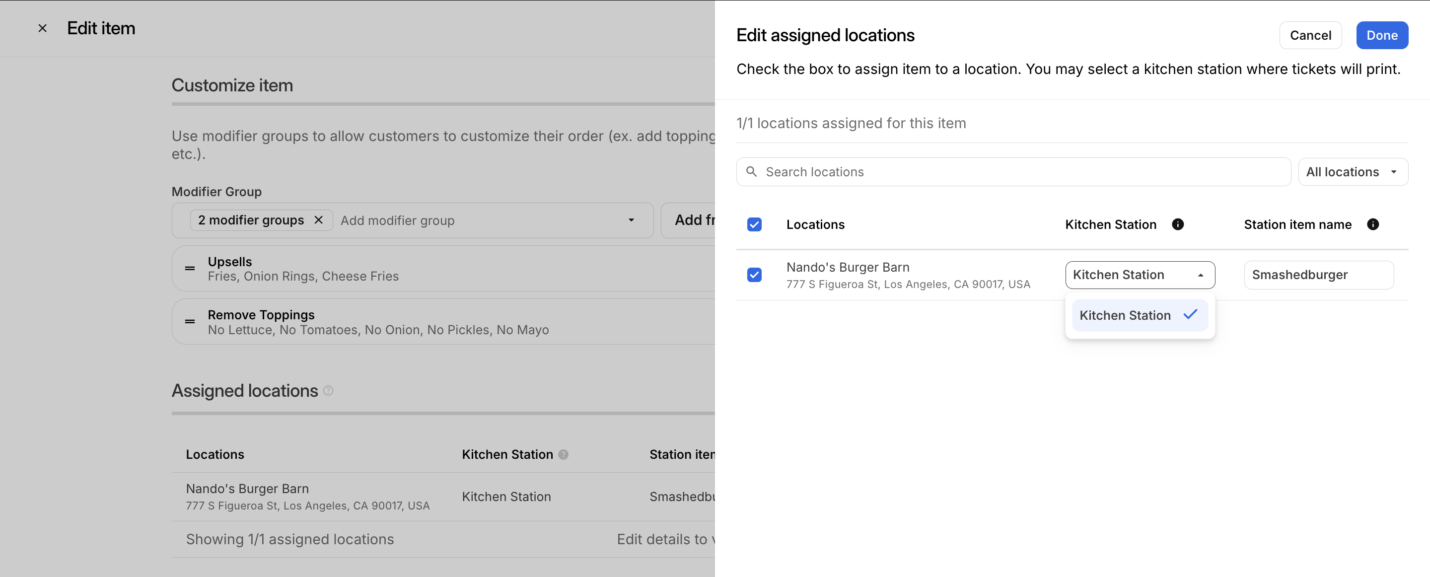 Select desired station from Kitchen Station drop-down. Note: Be sure to make selections to change for all or specific locations. Click [Done]. |