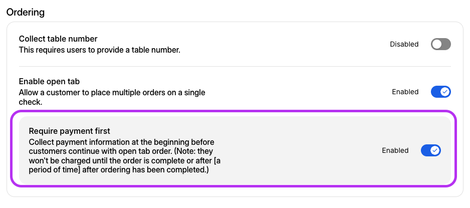 Desactiva Exigir pago primero para permitir que los comensales agreguen artículos a su pestaña abierta y paguen al final, cuando cierren su pestaña.
