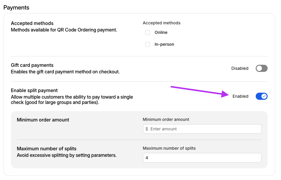 - No— Esta configuración es para pedidos con código QR para órdenes digitales en el local. Sin embargo, existe una función para Otter POS que permite pagos divididos. Obtén más información aquí.