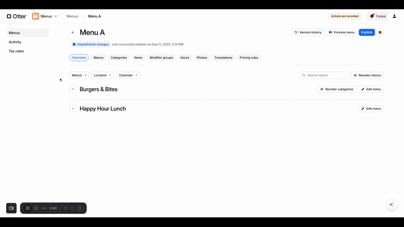 Usando el Administrador de Menús, puedes gestionar menús para todas las plataformas conectadas, por ejemplo: Otter POS, POS de terceros o socios de entrega.