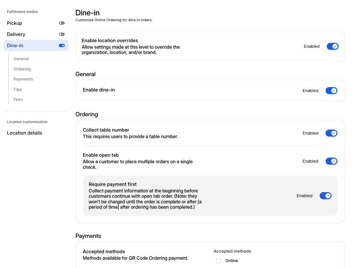 - Métodos aceptados: Selecciona para permitir que los comensales paguen sus pedidos en línea En línea, En persona o Ambos.