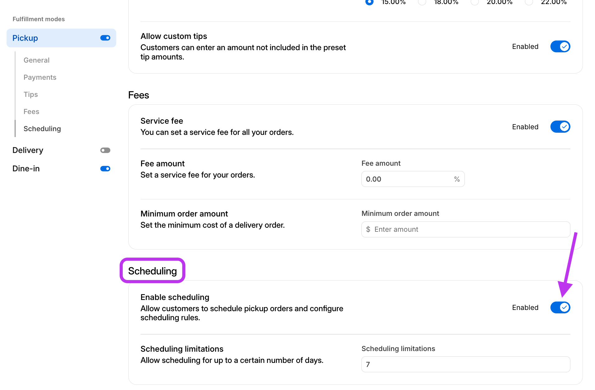 Activa el interruptor Habilitar programación para permitir pedidos programados.