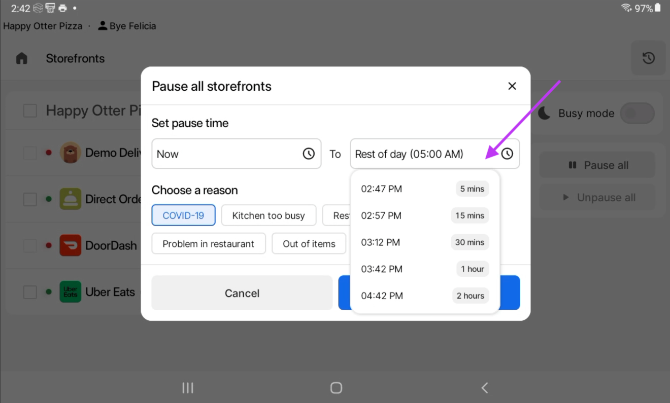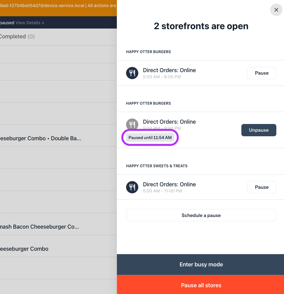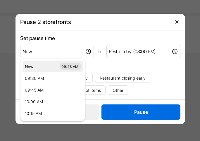 Normalmente, es necesario pausar una tienda durante circunstancias imprevistas o no planificadas (como aumentos en los direct orders, fallos en el equipo de cocina o problemas con el socio de entrega).