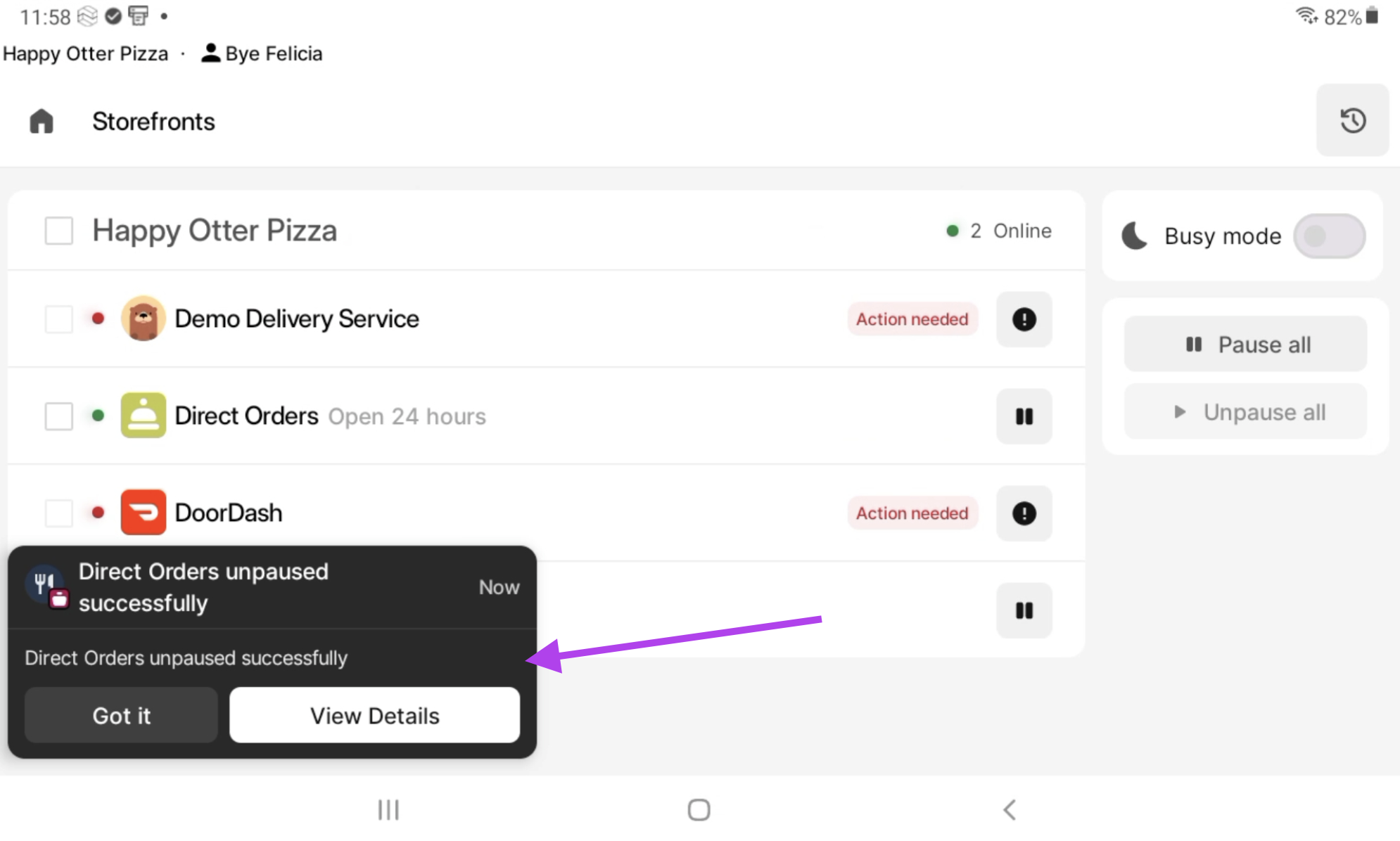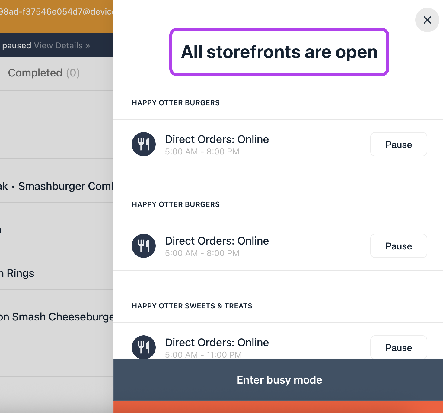 1. Desde la aplicación Storefronts en la tableta de Otter o POS activa Modo ocupado ON.