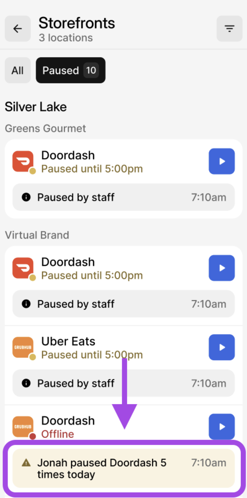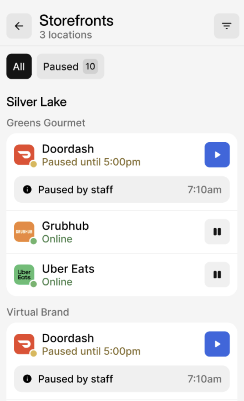 La función de Storefronts en la aplicación de Otter Merchant permite a los usuarios Pausar/Reanudar Storefronts en múltiples ubicaciones, de manera similar a como los usuarios lo hacen en la aplicación Storefronts de Otter POS.