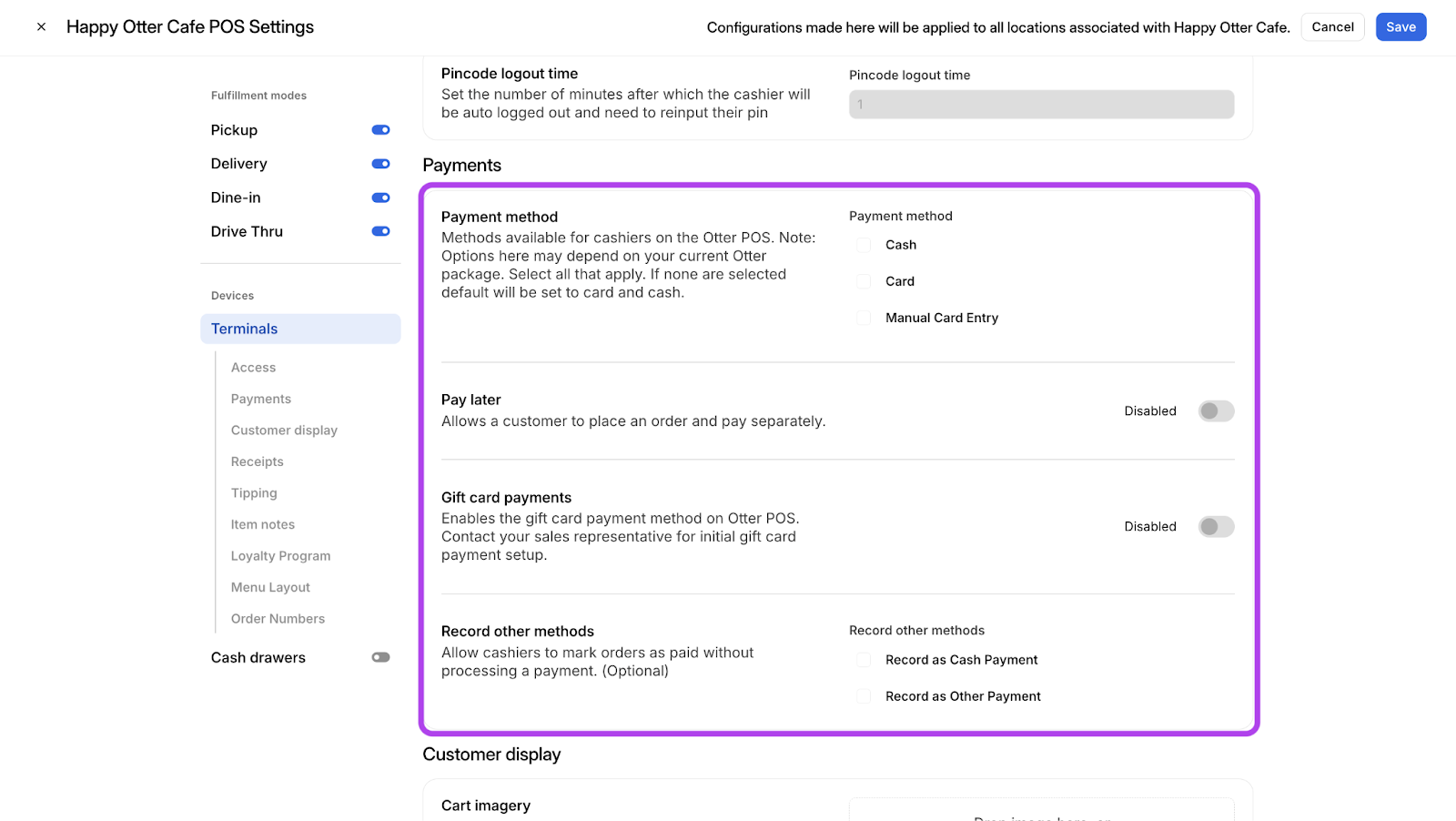 - Habilitar Sobrescrituras: Marca o activa un método de pago en la sección de Pagos para permitir que ese método esté disponible en el terminal Otter POS en una organización, ubicación y/o marca específica.