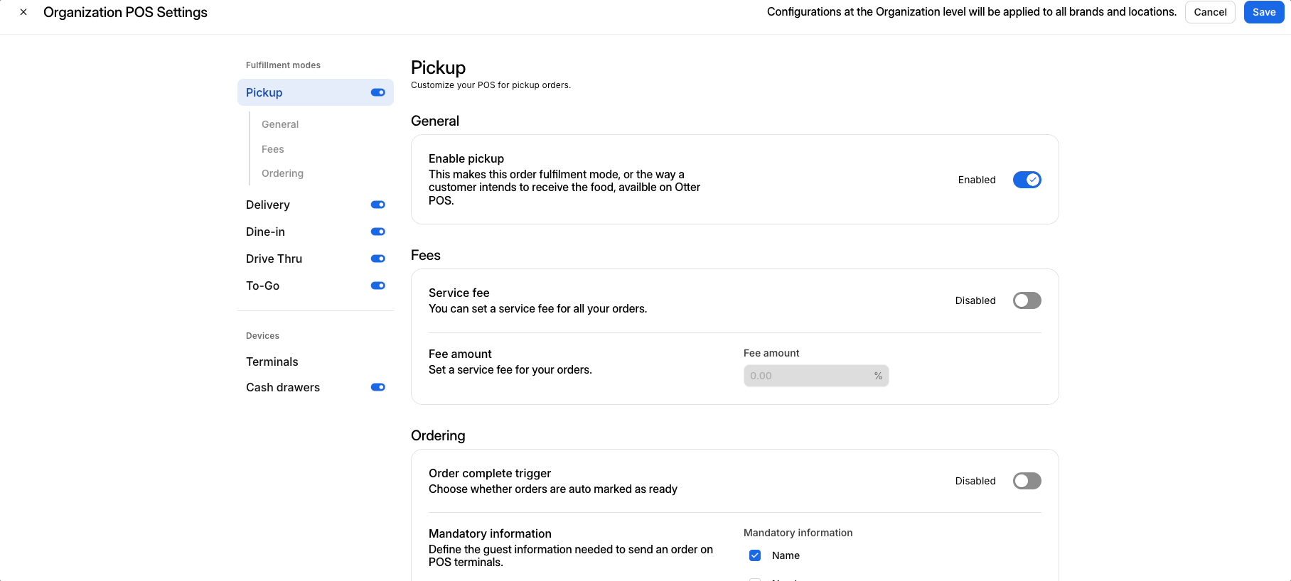 Sigue esta guía para aprender cómo configurar los ajustes de Otter POS en el Panel de Otter para modos de cumplimiento, terminales y/o cajones de efectivo específicos.