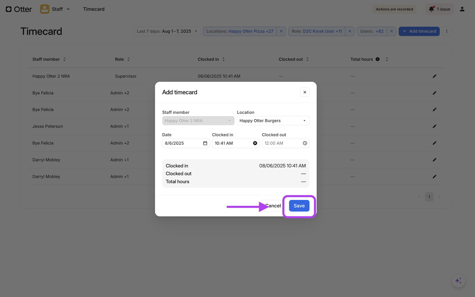 - Puedes editar una hora de entrada o salida actualizando la entrada de la tarjeta de tiempo desde la aplicación Staff del Panel de Otter > reporte de tarjeta de tiempo. Sigue los pasos indicados aquí para editar una entrada de tarjeta de tiempo en la aplicación Staff.