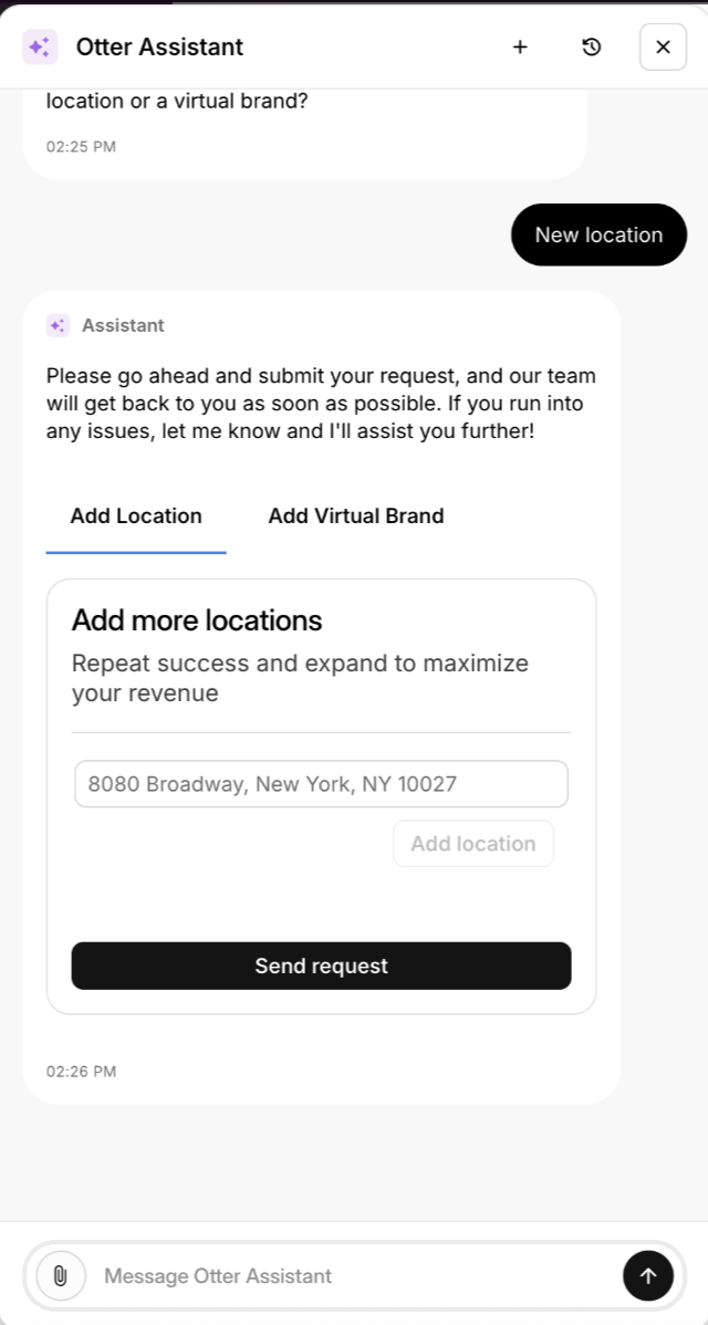 Para agregar una nueva ubicación a tu suscripción de Otter, puedes enviar una solicitud a través de nuestro chatbot Asistente de Otter desde el Panel de Otter o tu tableta de Otter.