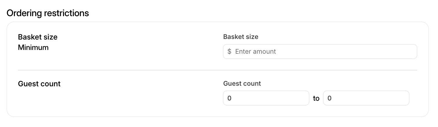 | Conteo de Invitados | Ingrese el rango de conteo de invitados permitido para pedidos de catering. |