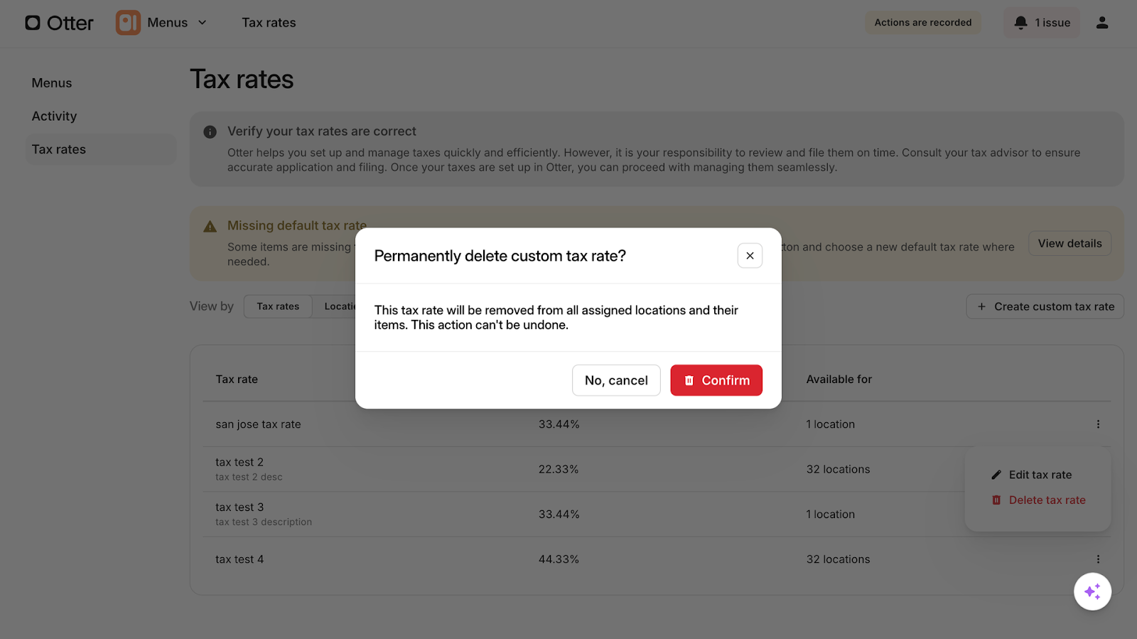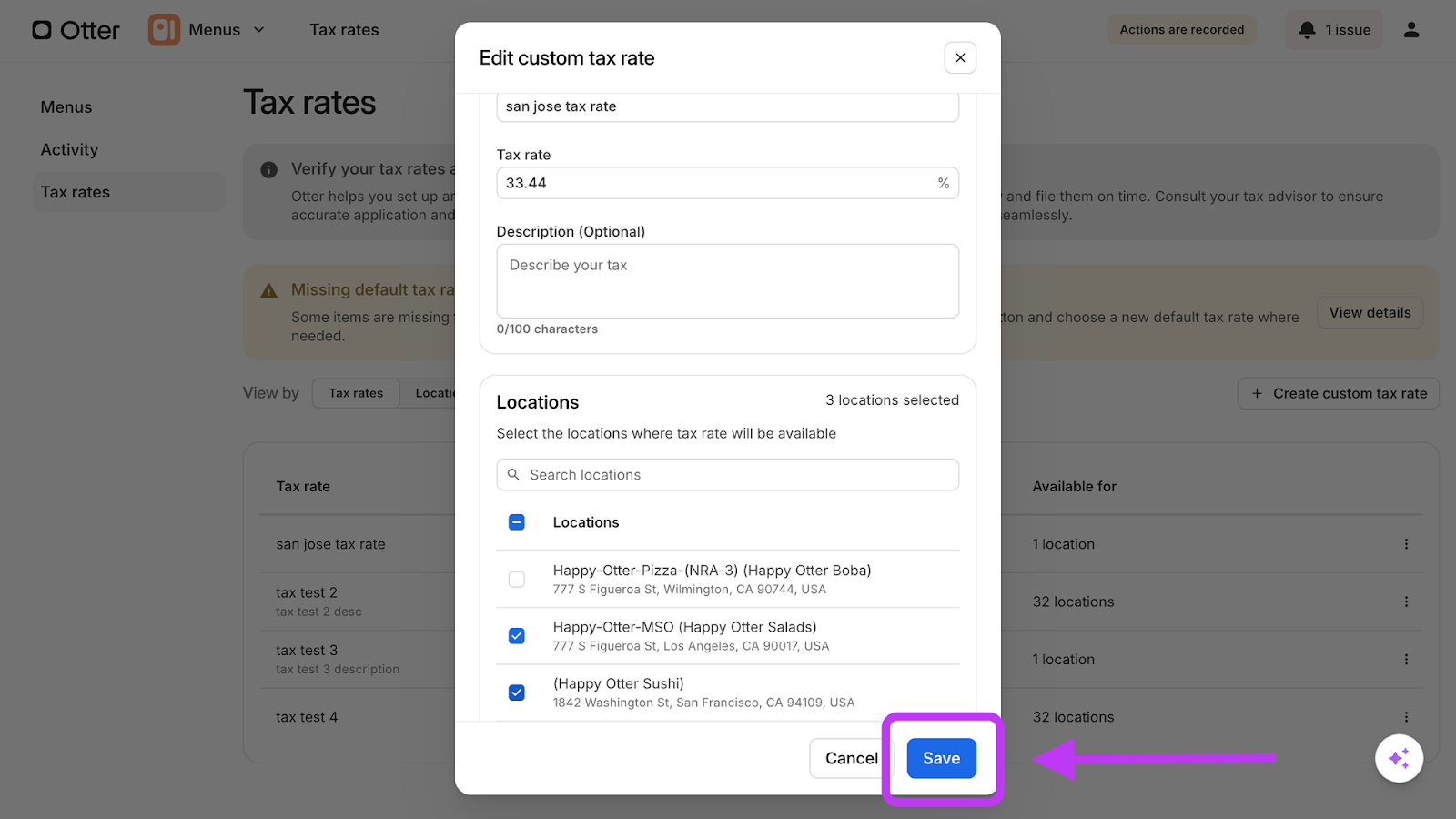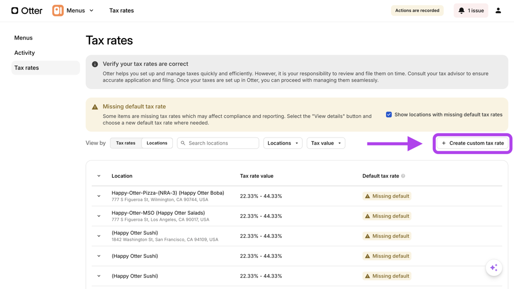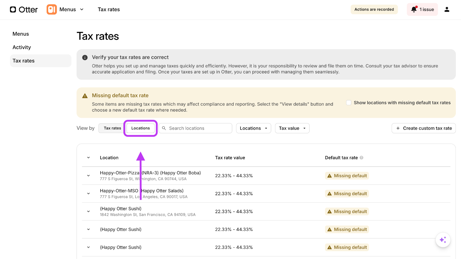 La tasa de impuesto deberá agregarse a nivel de artículo para la nueva ubicación. Si olvidas hacer esto al agregar una ubicación, Otter te notificará sobre la tasa de impuesto faltante para los artículos antes de publicar el menú para la nueva ubicación.