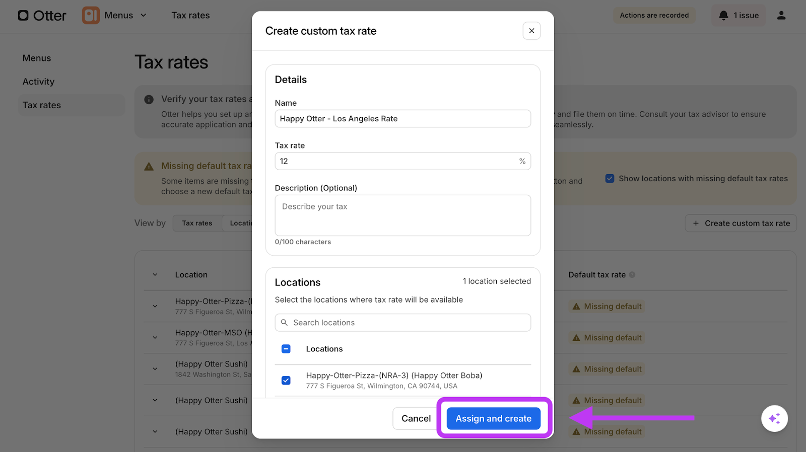 5 Una vez que hayas ingresado toda la información requerida, haz clic en el botón “Asignar y crear”. 6 La ventana se cerrará y regresarás a la página principal de Tasas de impuestos.