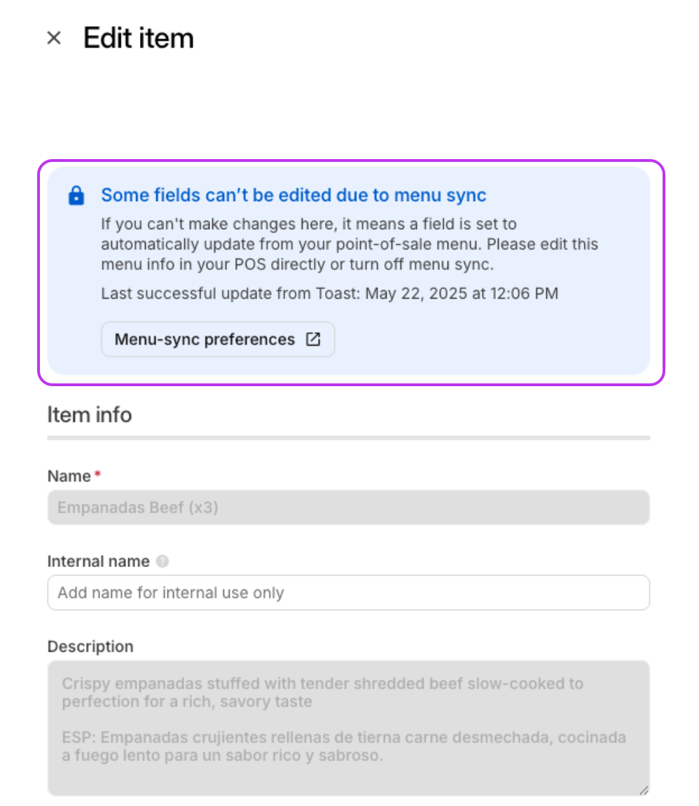 Cuando la Sincronización Automática de Menú está habilitada, puede haber algunos campos de menú que aparezcan no editables (atenuados) en el Panel de Otter. Esto se debe a que Otter está obteniendo información del menú directamente de tu POS de terceros— Otter te notificará en estos casos (mostrado abajo).