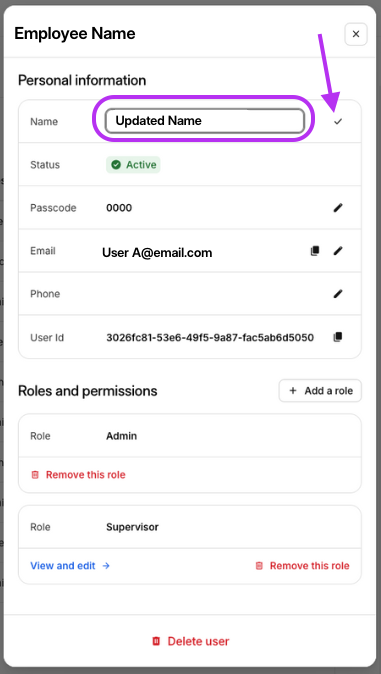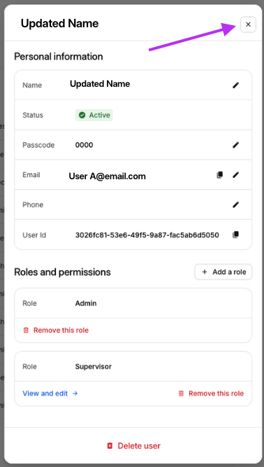Si necesitas editar alguno de los detalles del usuario, puedes hacerlo aquí.Una vez que hayas terminado, selecciona la [X] en la esquina superior derecha para volver a la lista de Usuarios.