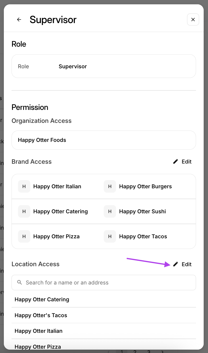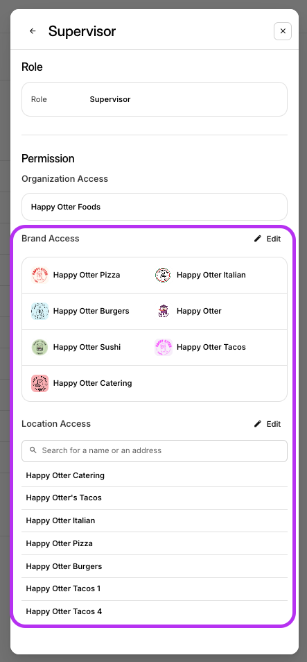 4 Haz clic en [Ver y editar]. 5 Haz clic en [Editar] junto a Acceso a Marca o Acceso a Ubicación para realizar cambios. 6 Selecciona ubicaciones o marcas para agregar a los permisos del usuario.