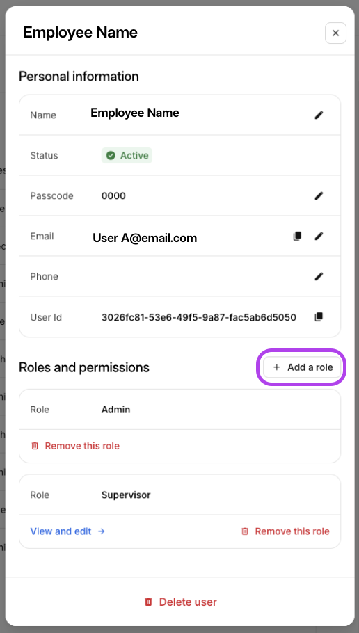 4 Haz clic en [+ Agregar un rol] para añadir un rol adicional al usuario seleccionado. 5 Selecciona el rol de la lista desplegable.