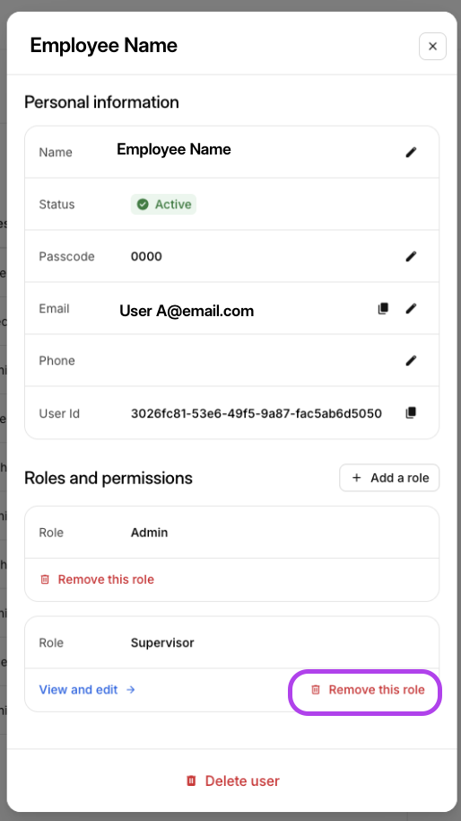 4 Haz clic en [Eliminar este rol] para eliminar el rol del usuario seleccionado. 5 Haz clic en [Eliminar rol] para confirmar. 6 La asignación de roles existente se mostrará en la sección de Roles y permisos.